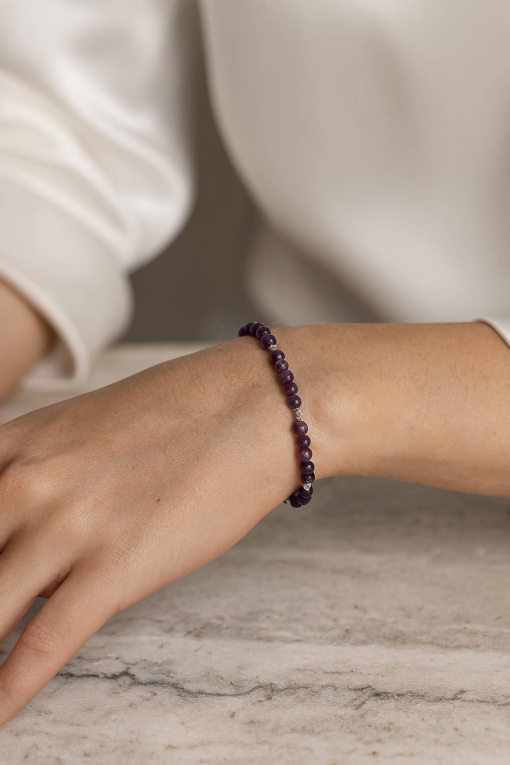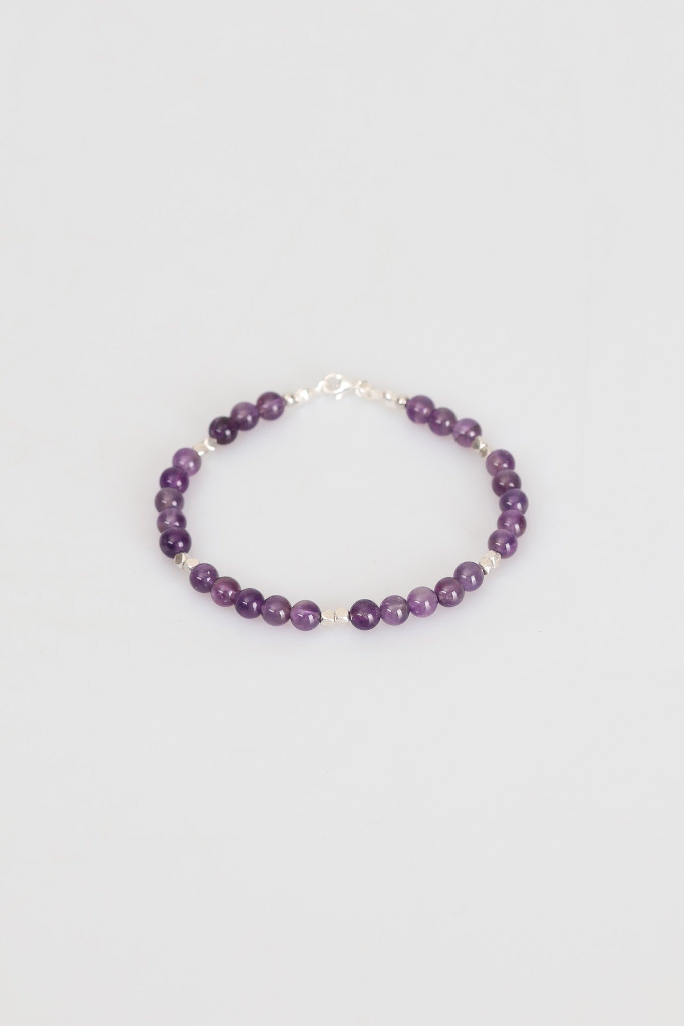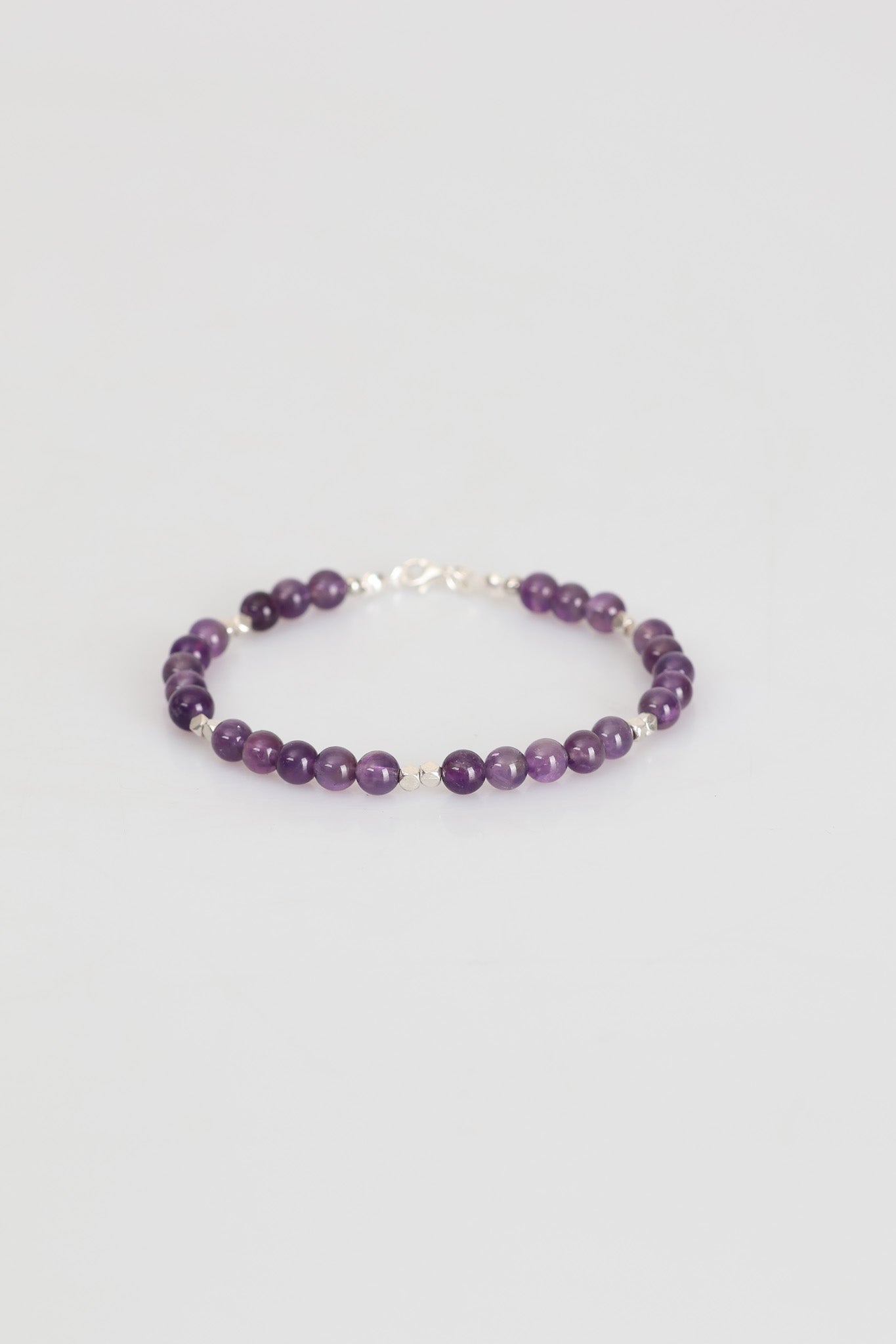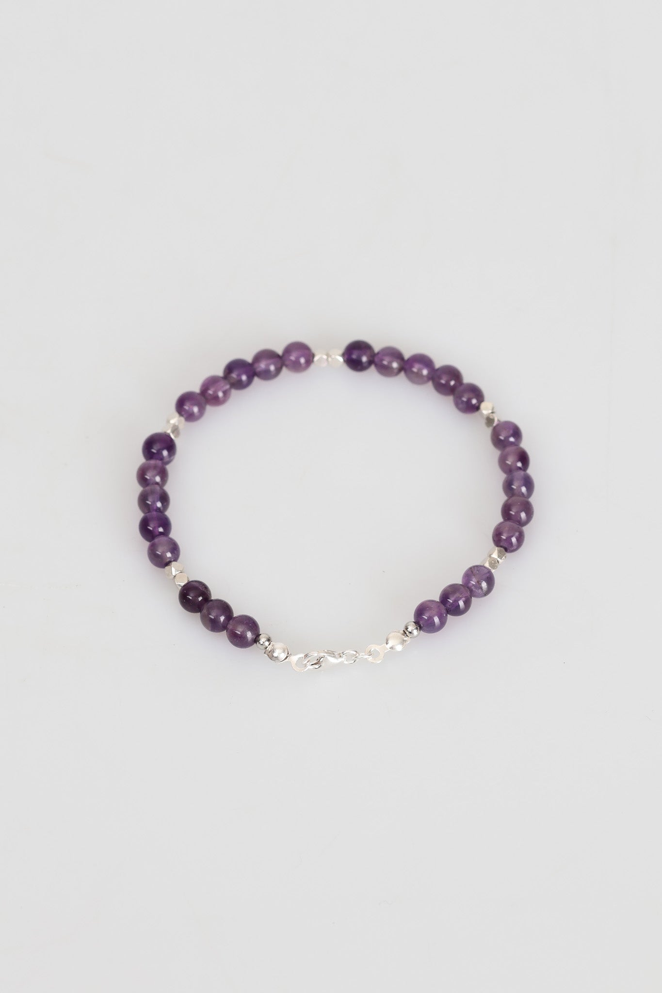 Zarif tasarımı ve doğal dokusuyla öne çıkan bu bileklik, yüksek kaliteli ametist taşlarıyla hazırlanmıştır. Her bir taş özenle seçilmiş, el işçiliğiyle bir araya getirilmiş ve şık bir gümüş kapama ile tamamlanmıştır.