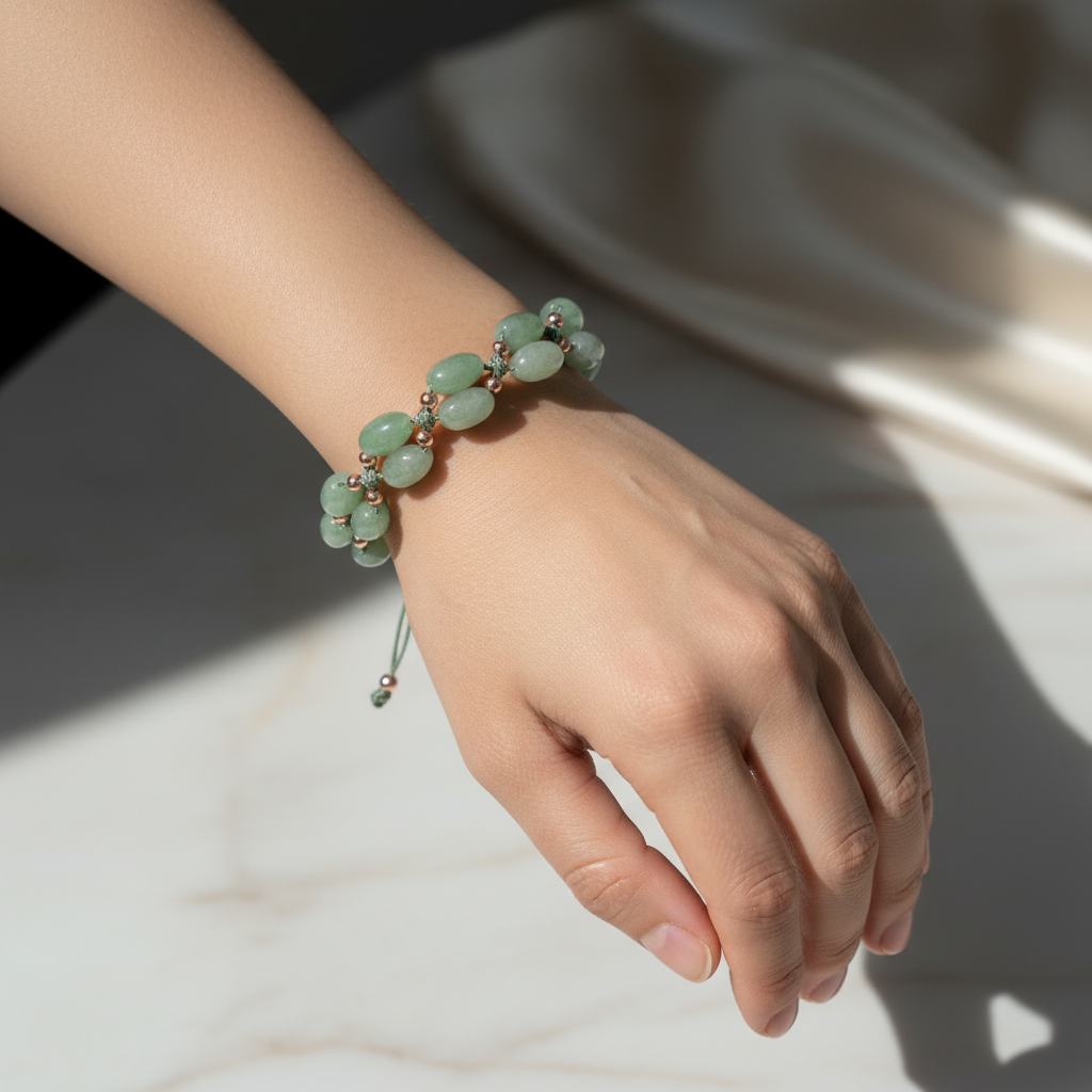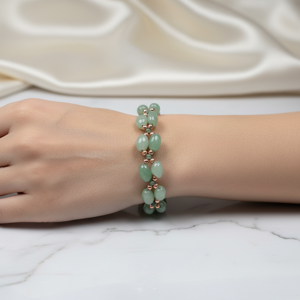 Yumuşak yeşil tonları ve doğal ipeksi dokusuyla bilinen Aventurin taşı, bu özel tasarım bileklikte üç sıra dizilimli el yapımı makrome örgü ile bir araya geliyor. Canlı ama sade görünümüyle hem günlük hem özel kombinlere uyum sağlayan bu tasarım, ayarlanabilir yapısıyla her bileğe rahatça uyum sağlar.