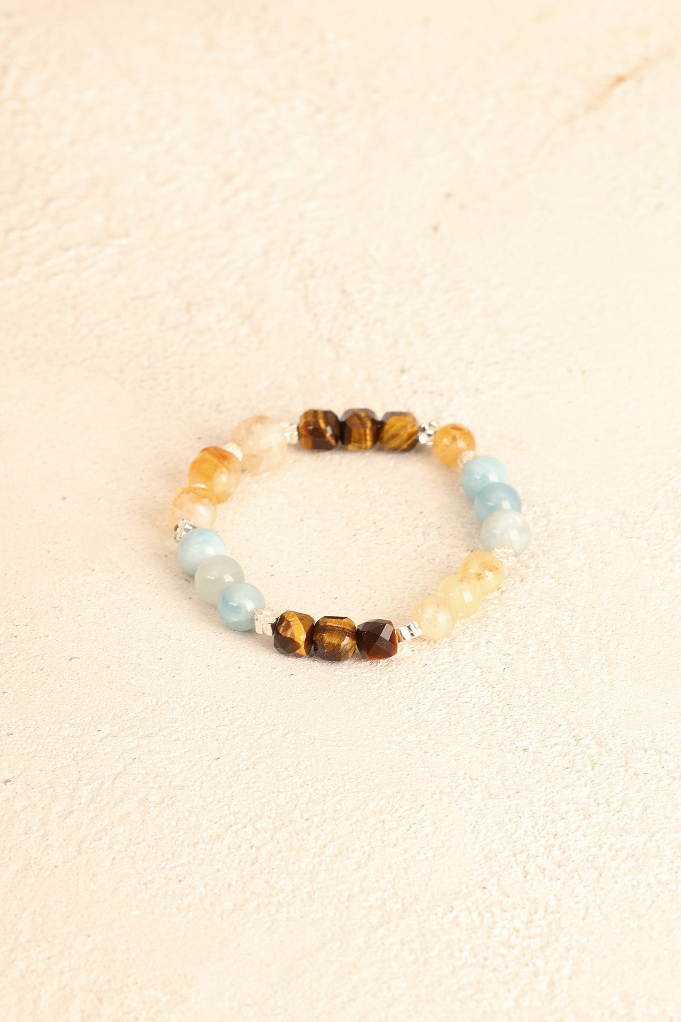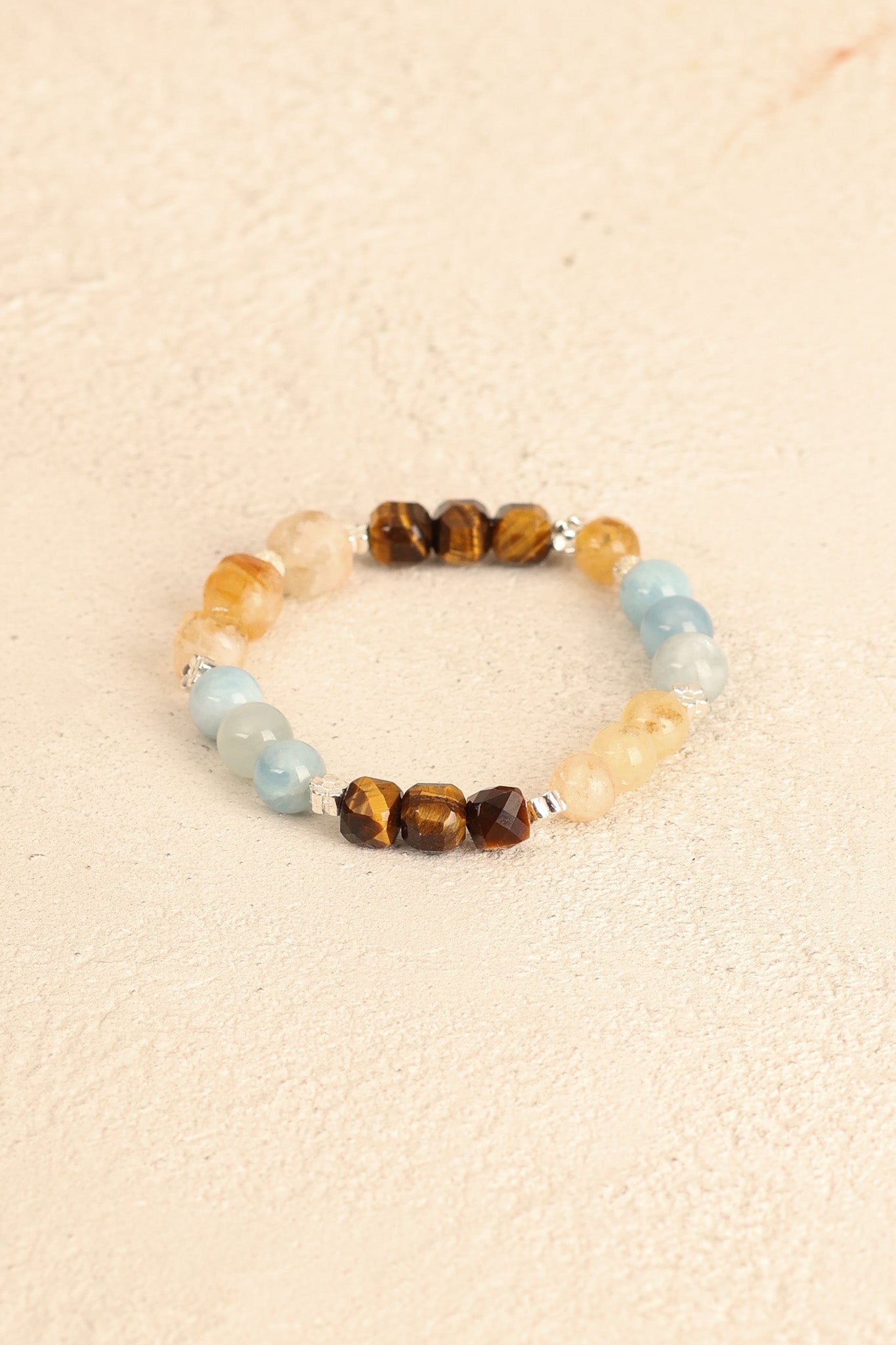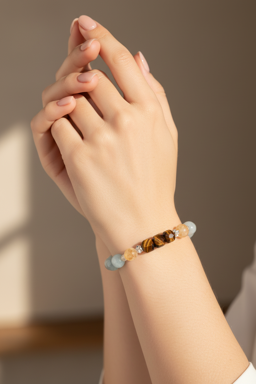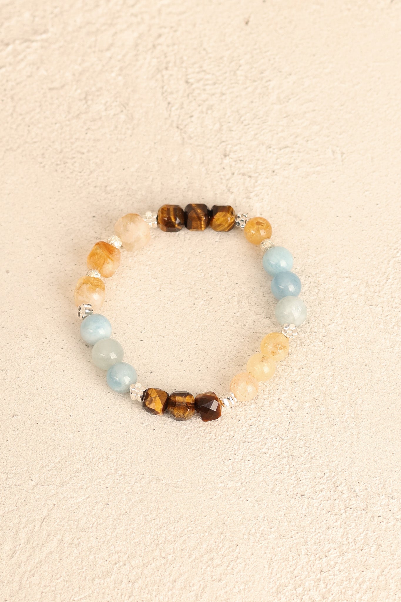 Modern ve şık tasarımıyla dikkat çeken bu bileklik, üç farklı doğal taşın özel uyumunu bir araya getiriyor. Akuamarin’in ferah tonları, sitrinin sıcak ışıltısı ve kaplan gözünün güçlü görünümü, tasarıma hem zarif hem de karakterli bir hava katıyor. Şıklığı tamamlayan gümüş aparat detayı, bilekliğe zarif bir bitiş sağlar.