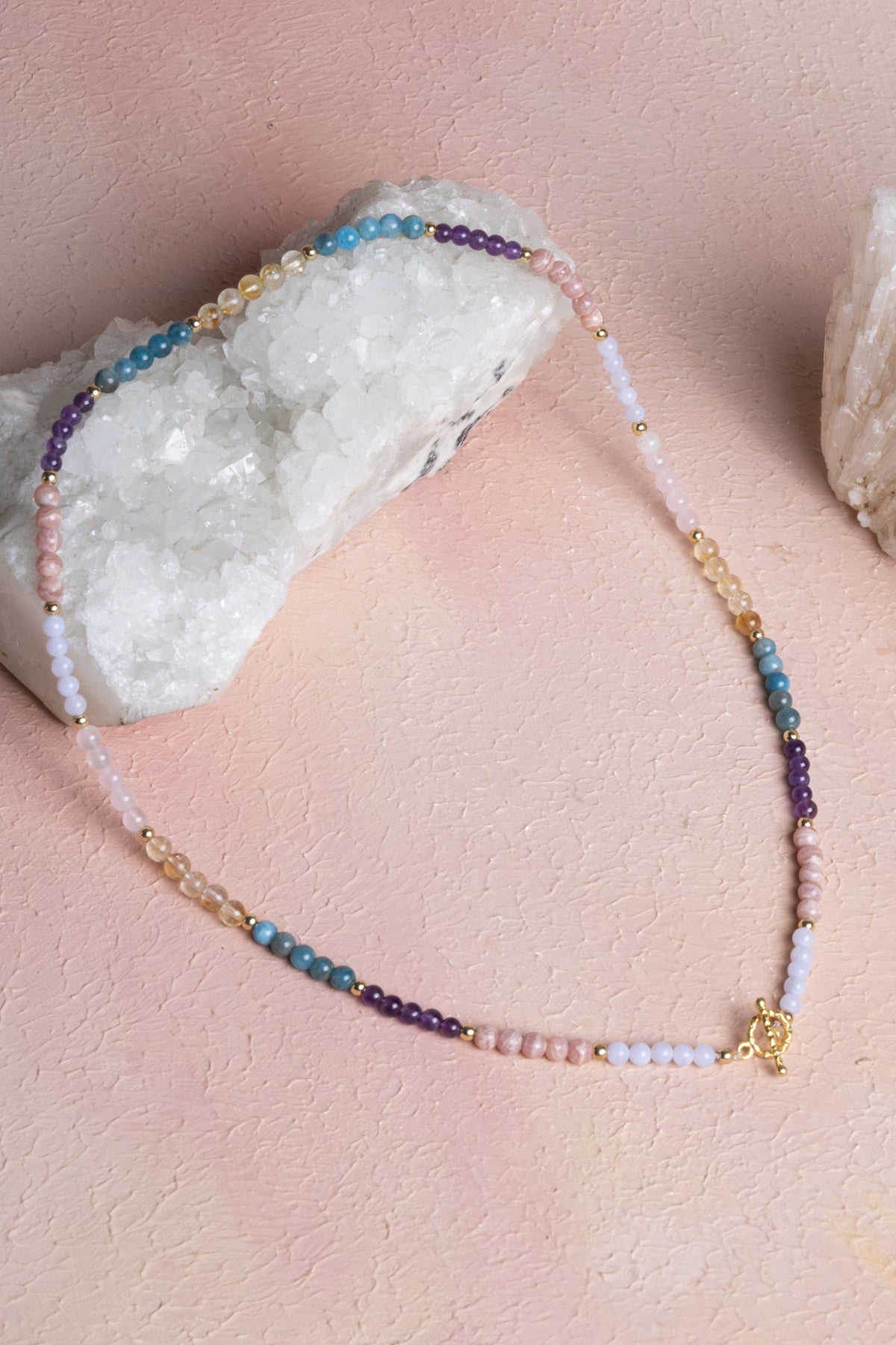 Farklı renk ve dokulara sahip bu doğaltaşlar kolyede dengeli ve estetik bir görünüm oluşturur. Pembe kuvars doğaltaşın zarif pembe tonları, sitrin doğaltaşın sıcak sarı rengi, apatit doğaltaşın canlı tonları, ametist doğaltaşın mor rengi, rodokrozit doğaltaşın karakteristik pembe dokusu ve kalsedon doğaltaşın doğal tonları kolyeye dikkat çekici bir karakter kazandırır.