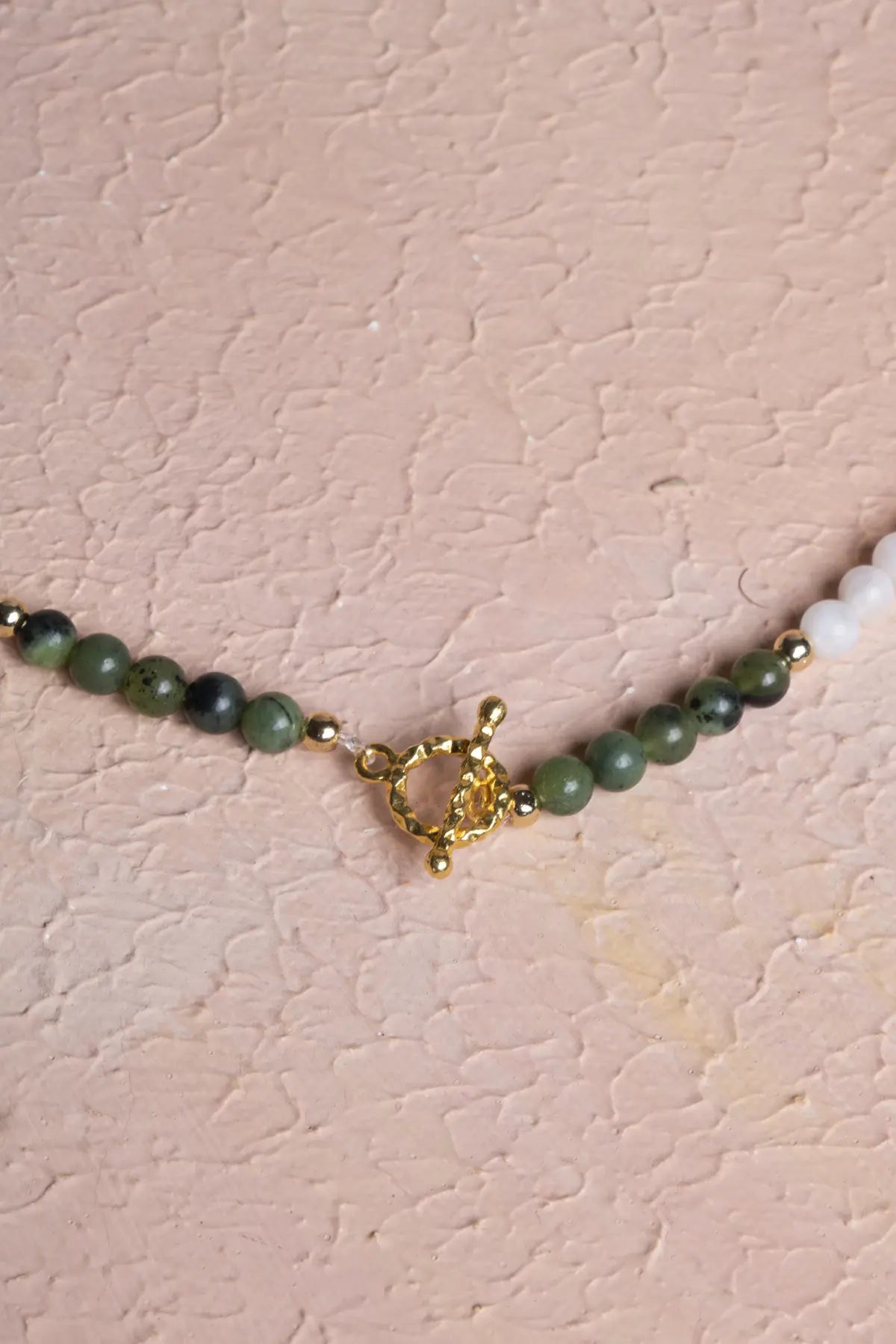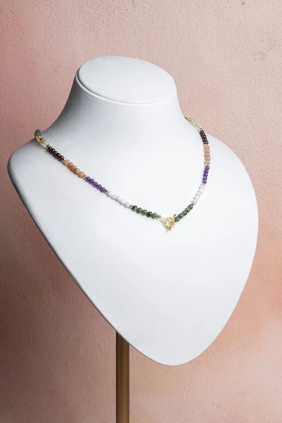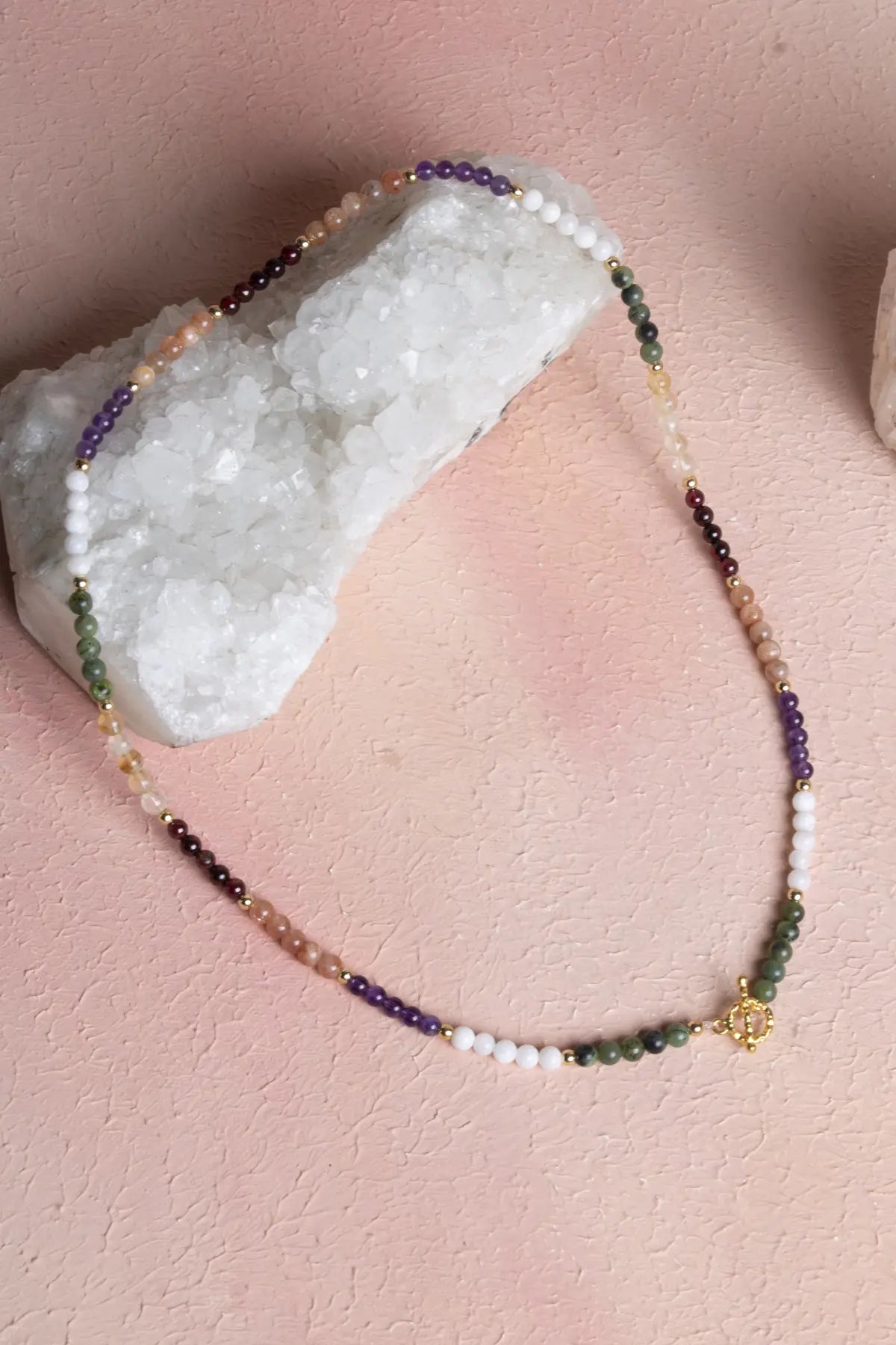 Farklı renk ve dokulara sahip bu doğaltaşlar kolyede dengeli ve estetik bir görünüm oluşturur. Yeşim doğaltaşın doğal yeşil tonları, sitrin doğaltaşın sıcak sarı renkleri, ametist doğaltaşın mor tonları, ay taşı doğaltaşın zarif görünümü, güneş taşı doğaltaşın canlı tonları ve lal doğaltaşın kırmızı renkleri kolyeye dikkat çekici bir karakter kazandırır.