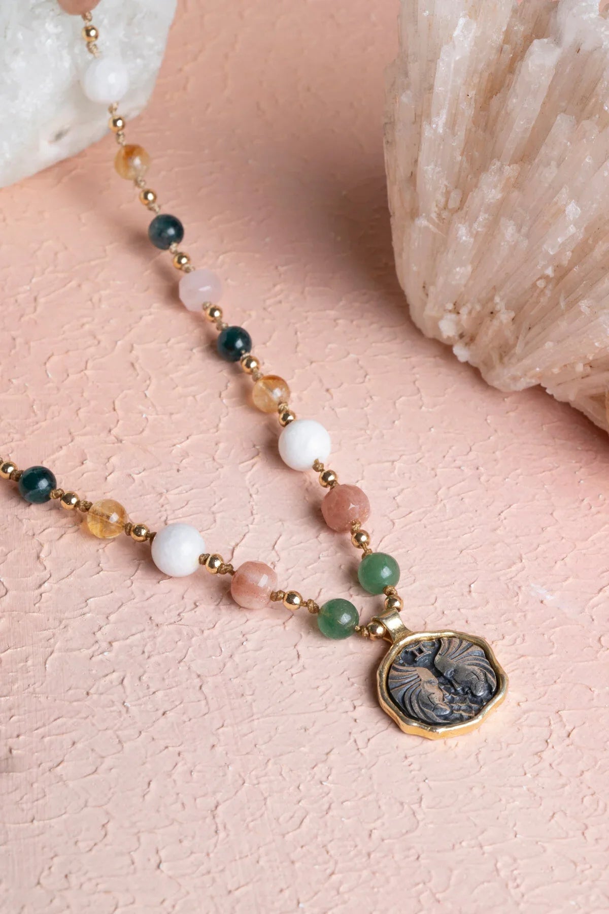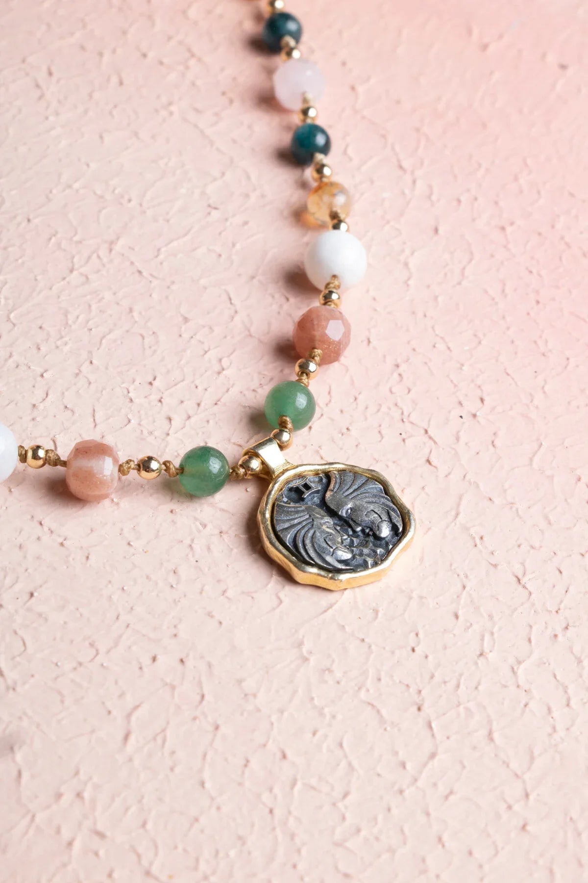 Aventurin, güneş taşı, ay taşı, sitrin ve apatit taşlarından oluşan sertifikalı ikizler burcu doğaltaş makrome kolye.
