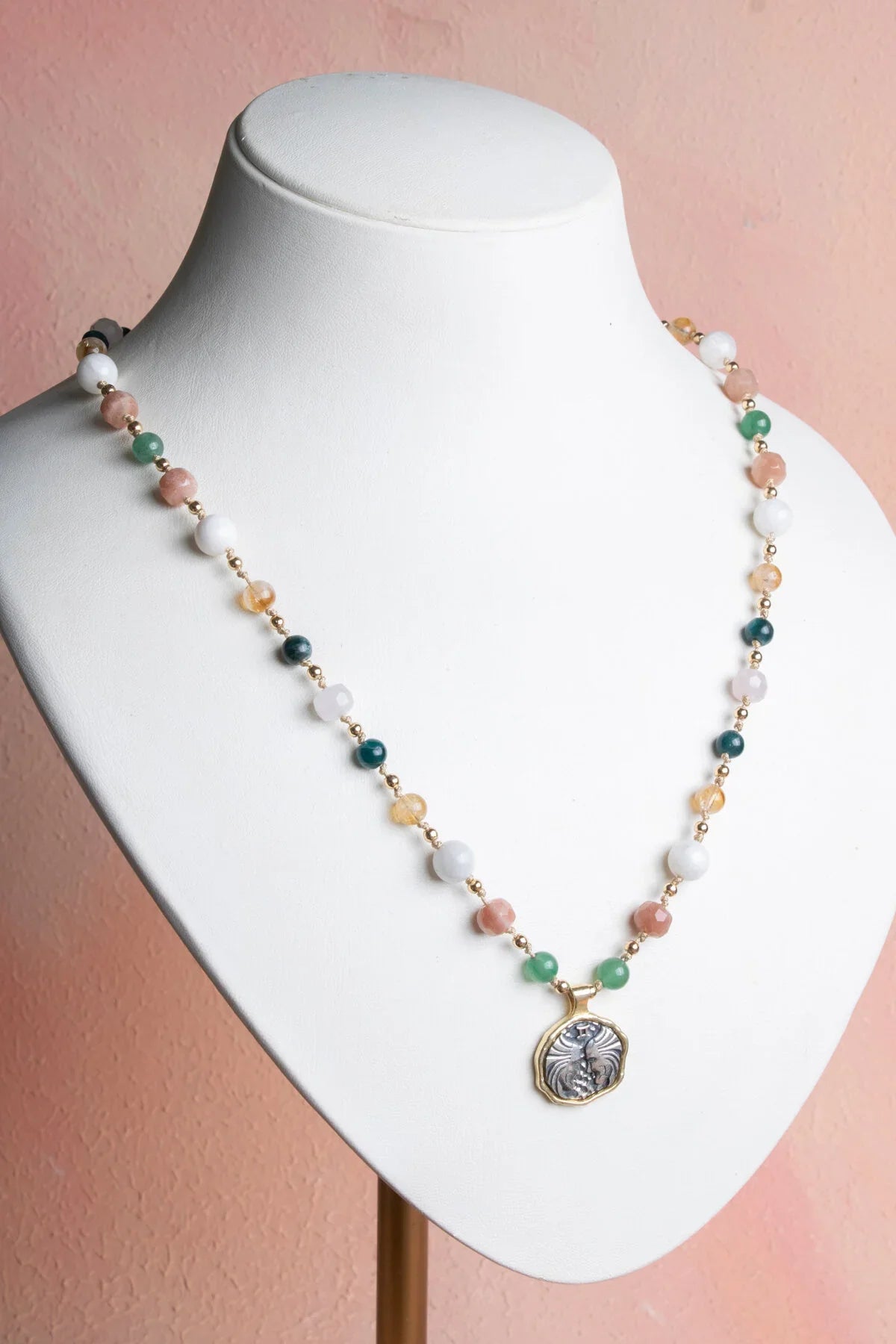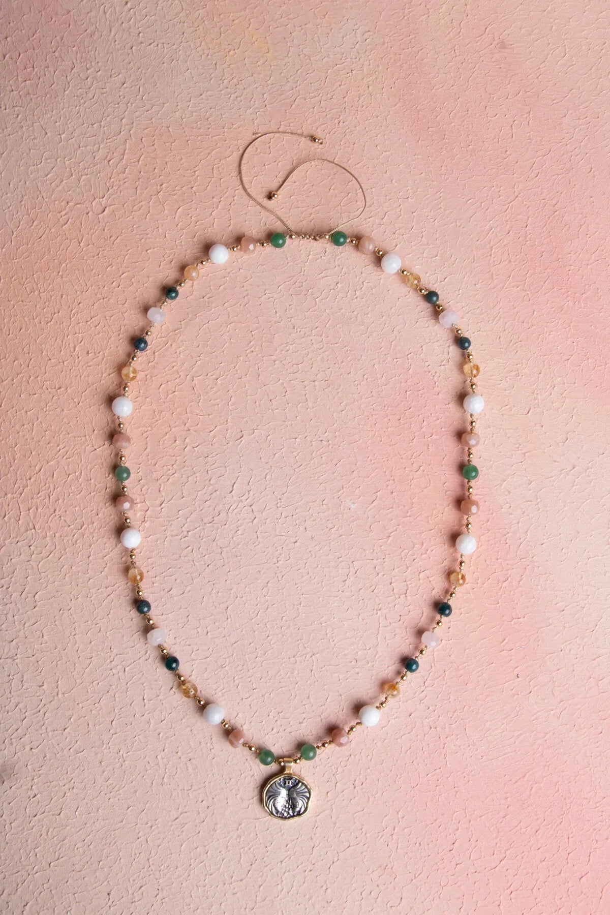 Farklı renk ve dokulara sahip bu doğaltaşlar kolyede dengeli ve estetik bir görünüm oluşturur. Aventurin doğaltaşın doğal yeşil tonları, güneş taşı doğaltaşın sıcak renkleri, ay taşı doğaltaşın zarif görünümü, sitrin doğaltaşın canlı sarı tonları ve apatit doğaltaşın parlak tonları kolyeye dikkat çekici bir karakter kazandırır.