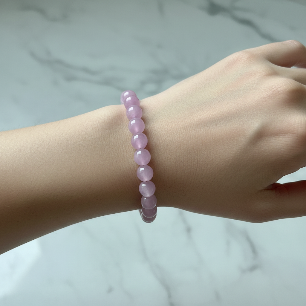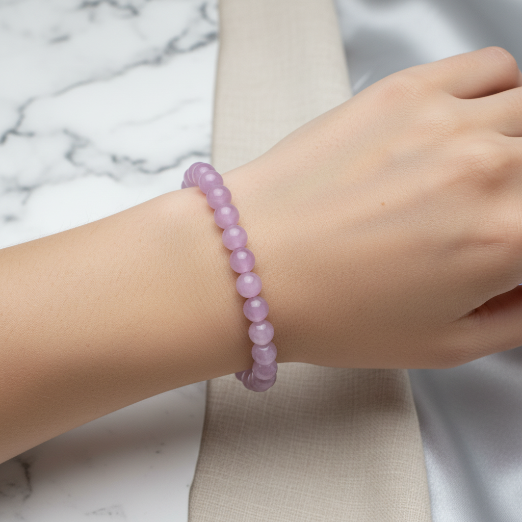 Pastel pembemsi-lila tonlarıyla zarafetin ve yumuşaklığın simgesi haline gelen Kunzit taşı, bu özel bileklikte 6 mm yuvarlak (küre) kesim formunda sunuluyor. %100 doğal Kunzit taşlarından oluşan bu model, hafif yapısı ve ince dizilimiyle bilekte narin ama dikkat çekici bir görünüm oluşturur.