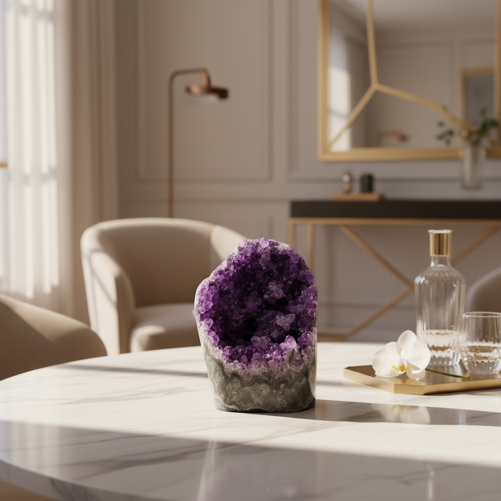 Kristal yüzeyinde bulunan doğal oluşumlar ışıkla temas ettiğinde, taşın iç dokusunu ortaya çıkaran güçlü bir parlaklık ve derinlik oluşur. Koleksiyonluk bir değer taşıyan bu model, dekoratif sergilemelerde zarif bir doğal taş detayına dönüşür.