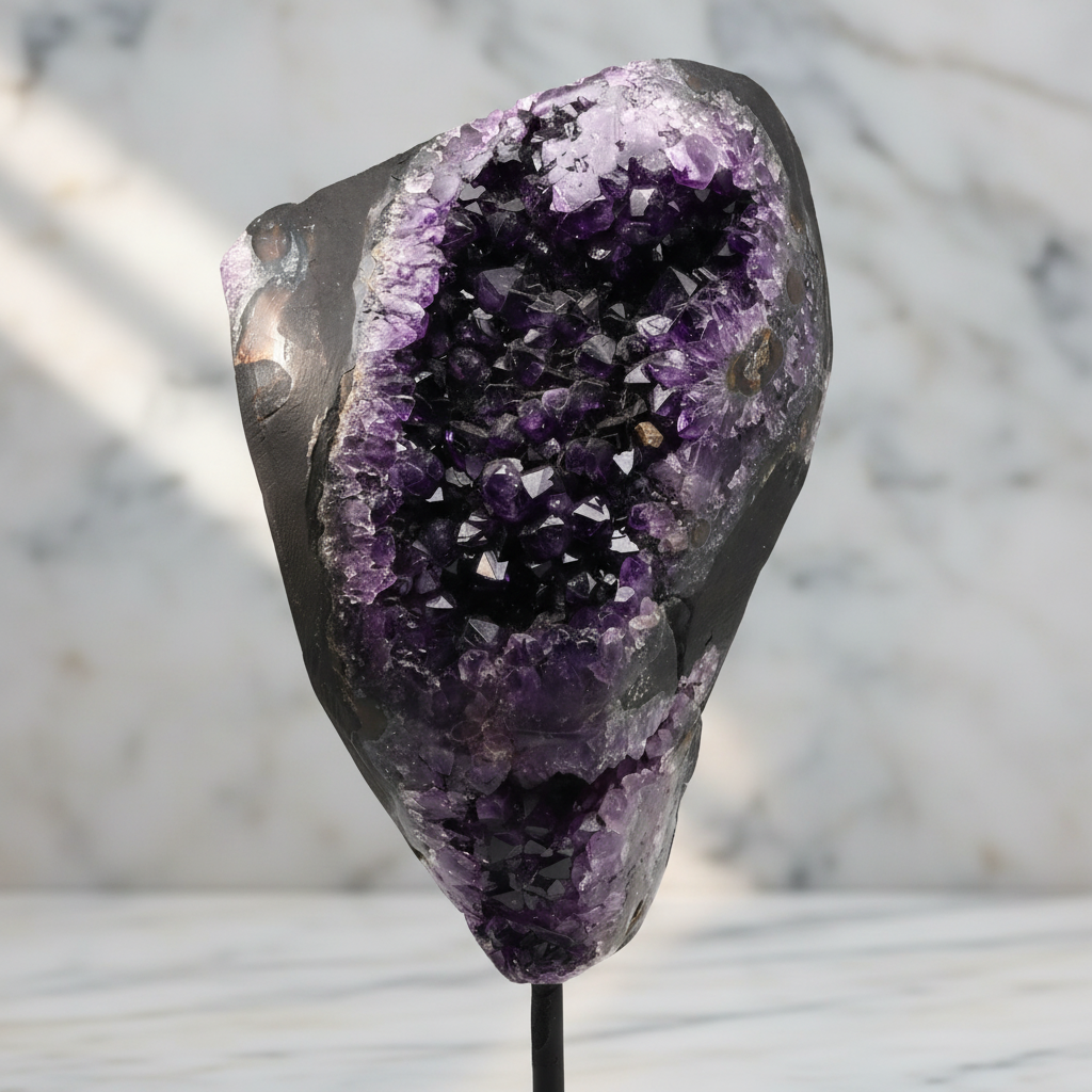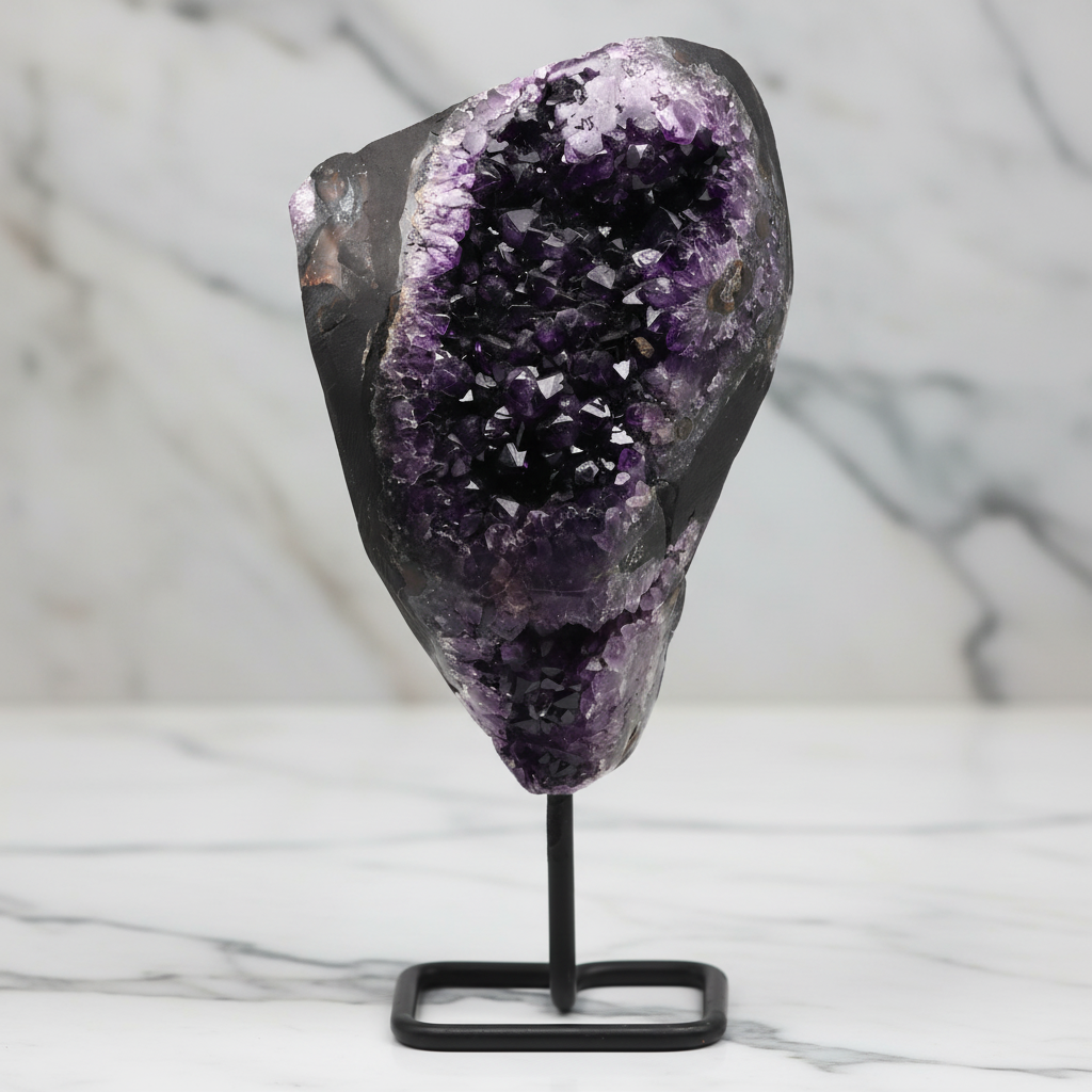 Safnaturel’in lüks koleksiyonunda yer alan Ametist Doğal Taş Standlı Ham Parça, mor tonlarının derinliği ve kristal dokusunun göz alıcı parlaklığıyla dikkat çeken benzersiz bir doğal taş örneğidir. 14,5 cm genişliğinde, 30 cm uzunluğunda ve 3423 gram ağırlığındaki bu özel parça, ametistin zarafetini modern bir sunumla birleştirir.
