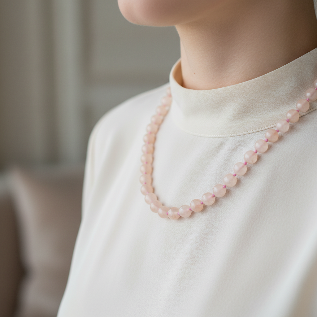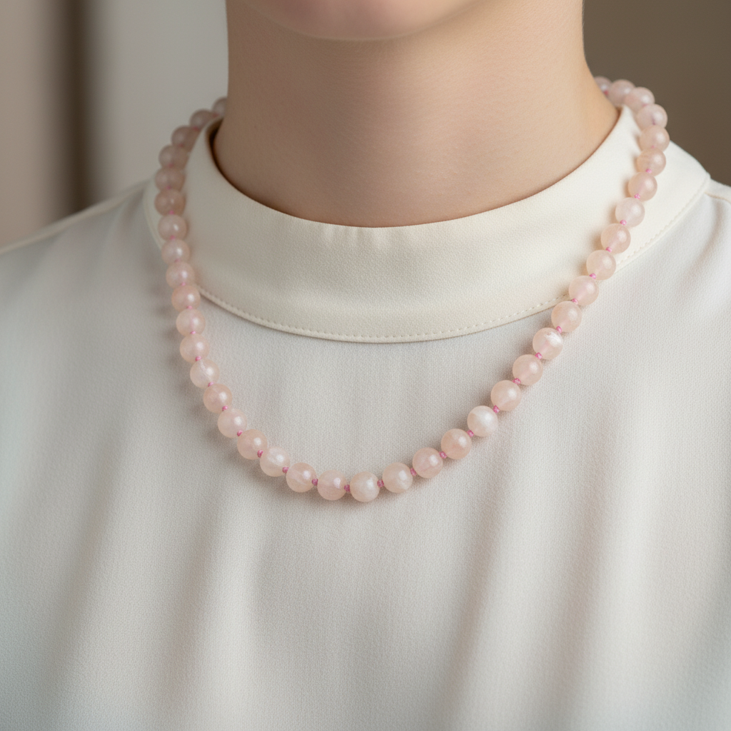 Morganit 8 mm Düğümlü Doğal Taş Kolye