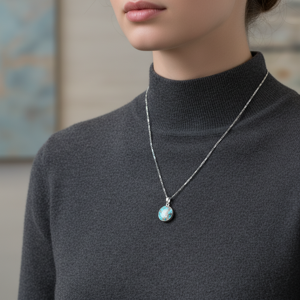 Safnaturel’in zarif koleksiyonunda yer alan Turkuaz Firuze Doğal Taş Gümüş Kolye, doğanın canlı mavi tonlarını el işçiliğiyle harmanlayan özel bir tasarımdır. Her bir doğal firuze taşı, kendine özgü damar yapısı ve renk geçişleriyle tamamen benzersiz bir görünüm sunar.