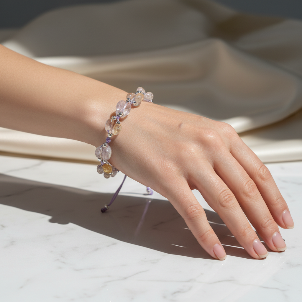 El işçiliğiyle örülmüş makrome ip üzerine dizilen doğal ametrist (ametist + sitrin) taşları, ışıkla buluştuğunda zarif bir renk geçişi oluşturur. Ayarlanabilir formu sayesinde farklı bilek ölçülerine kolayca uyum sağlar ve konforlu bir kullanım sunar.