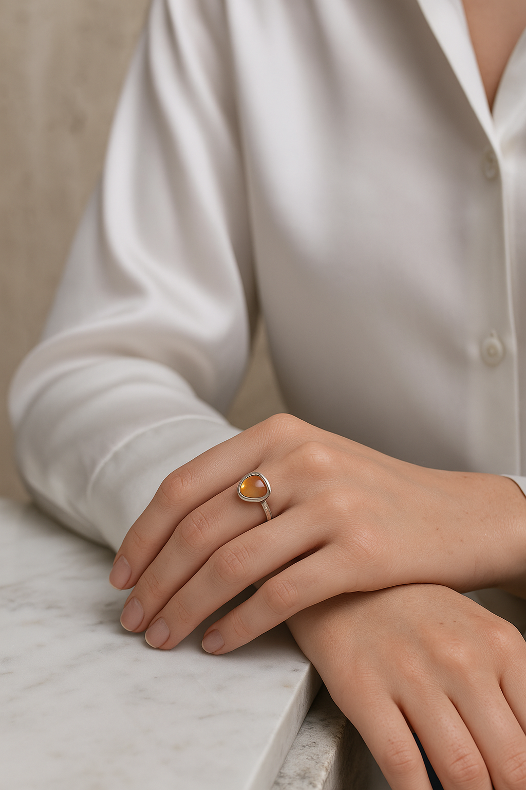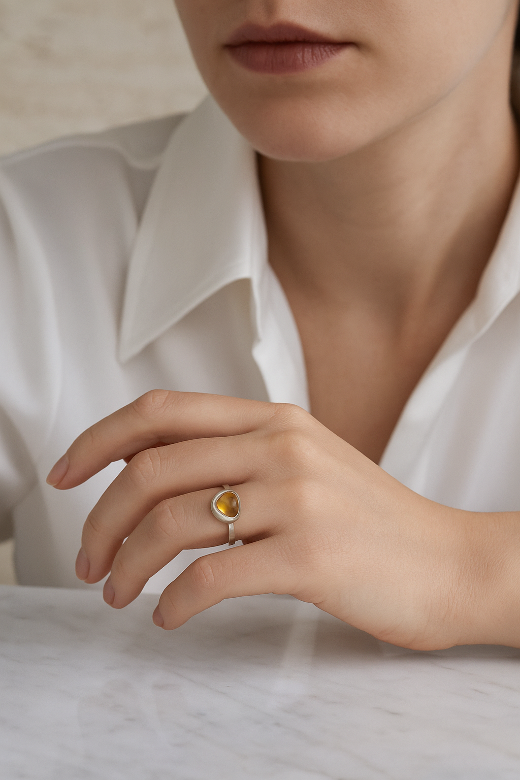 Güneşin enerjisini yansıtan doğal sitrin taşı, 925 ayar saf gümüşle birleşerek zarif ve dikkat çekici bir tasarıma dönüşüyor. 15 beden olarak hazırlanan bu yüzük, her sipariş için tek tek ve yalnızca o kullanıcıya özel olarak üretilir. Kullanılan sitrin taşı tamamen doğaldır; her bir taş, kendine özgü renk tonu ve kristal yapısıyla farklılık gösterir.