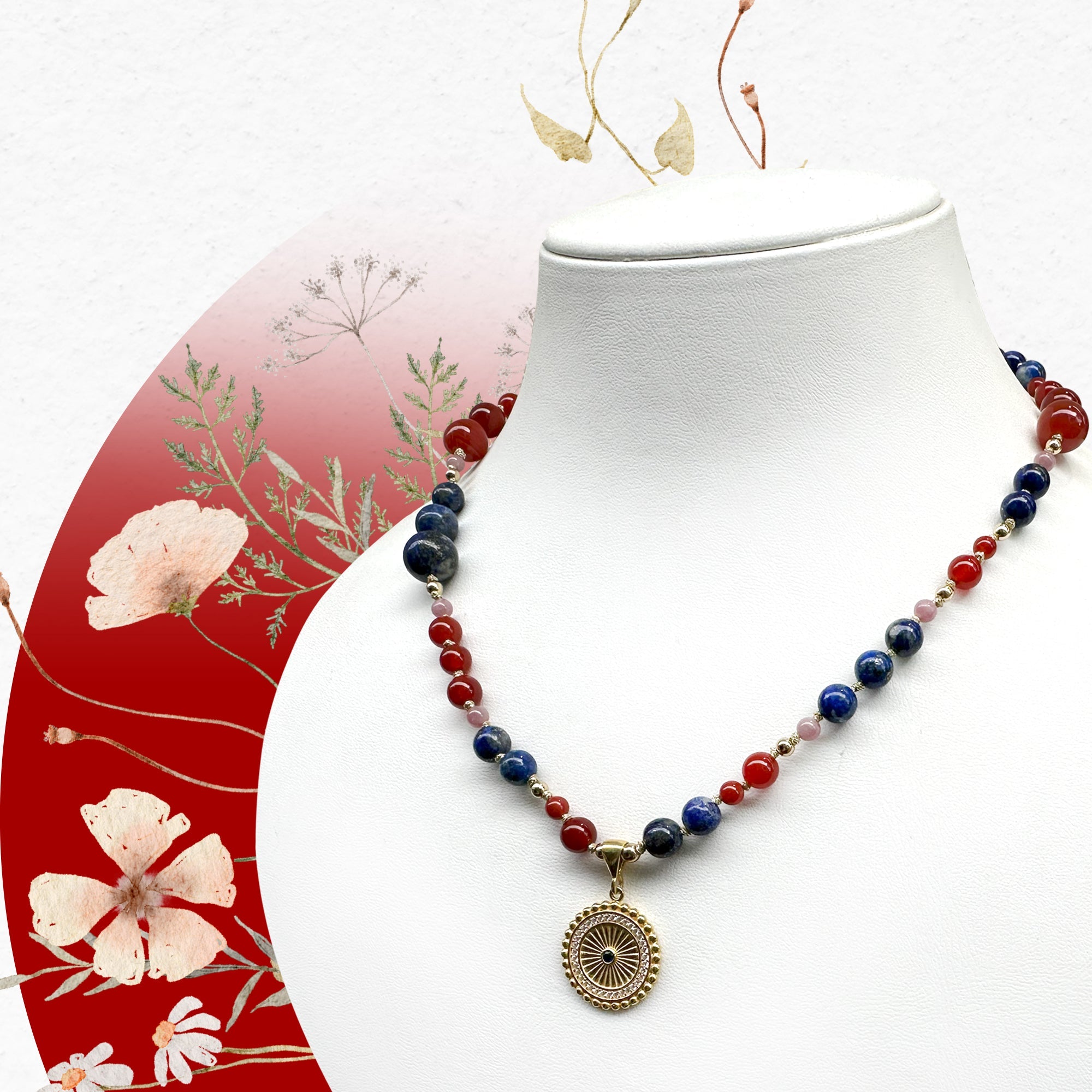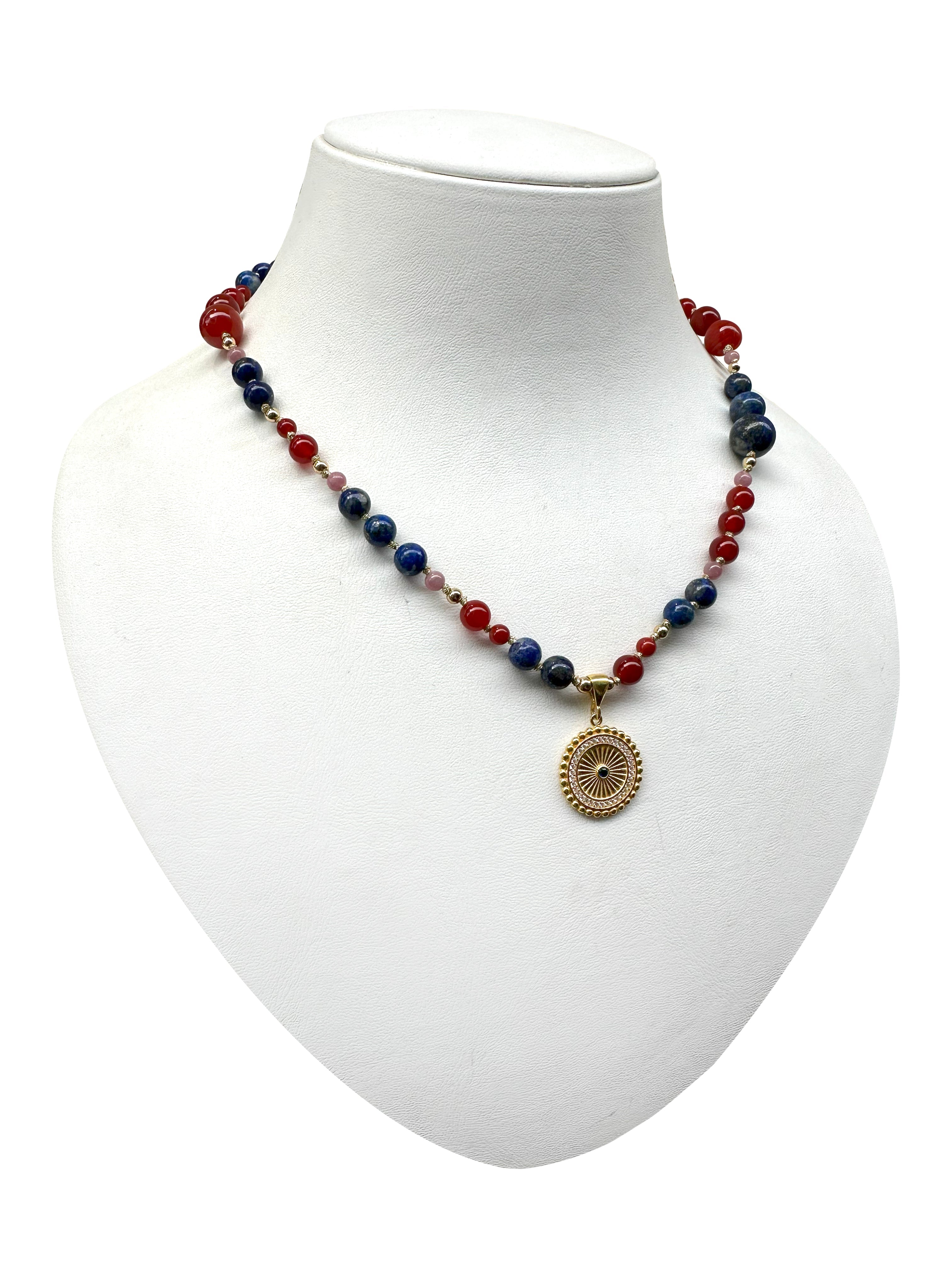 Lapis lazulinin asaletini, kırmızı akik taşının enerjik tonlarını ve kunzitin zarif pembesini gümüş detaylarla buluşturan bu kolye; koleksiyonuna modern ve dikkat çekici bir parça eklemek isteyenler için ideal seçimdir.