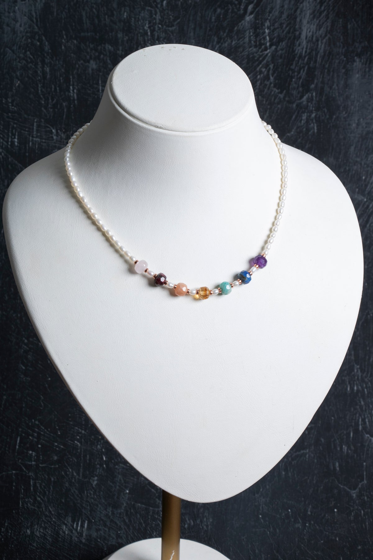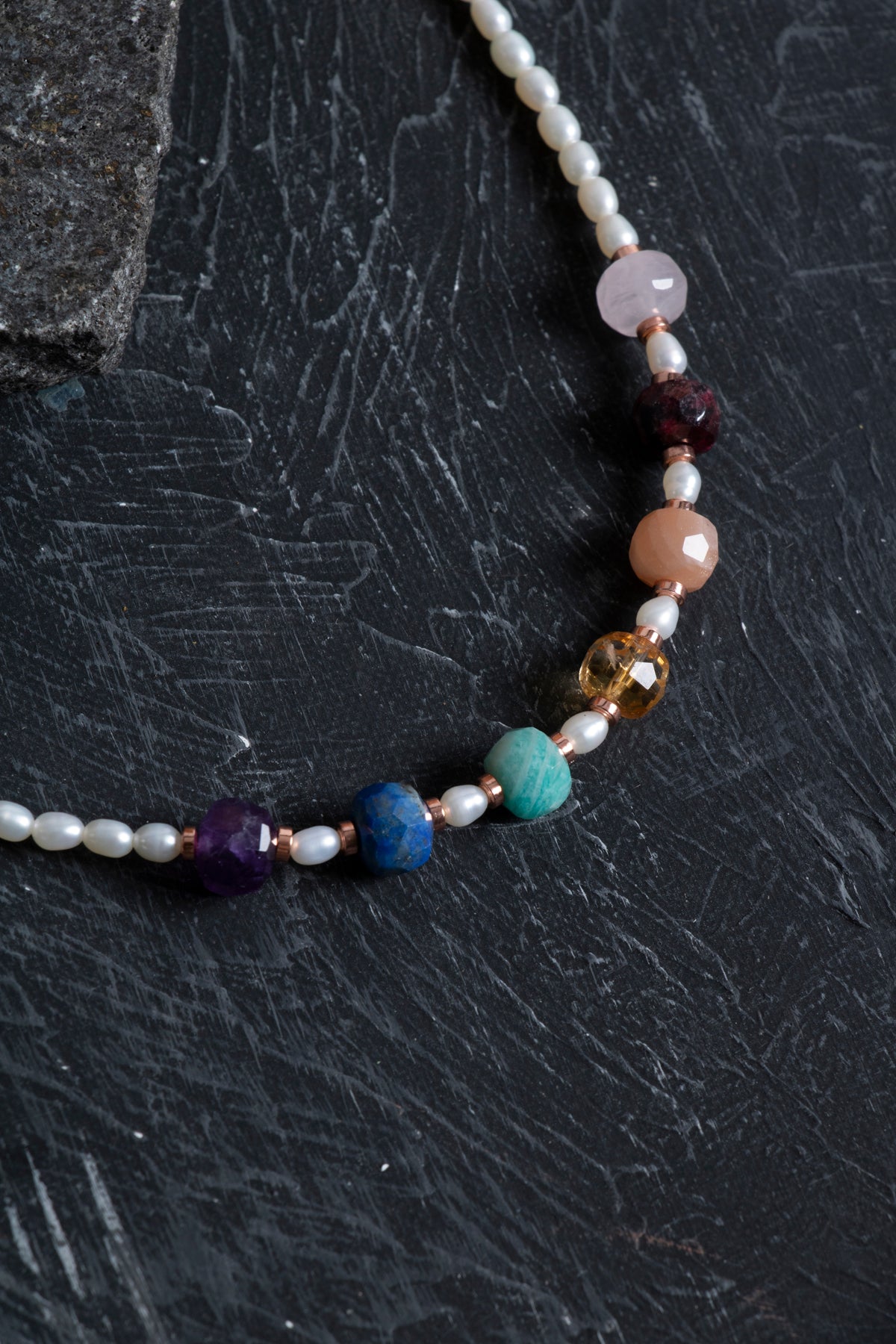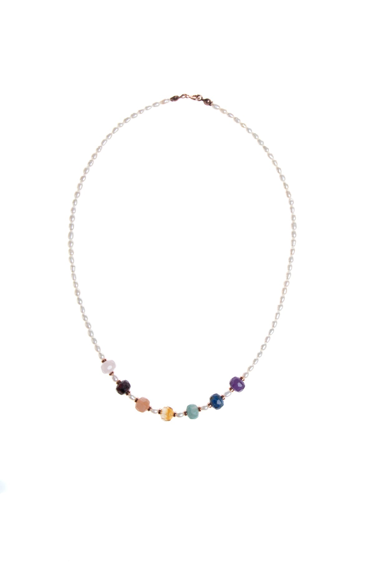Pembe kuvars, lal, amazonit, sitrin, ametist, güneş taşı, lapis ve inci taşlarının bir araya gelmesiyle tasarlanan bu doğal taş kolye, renkli ve zarif görünümüyle dikkat çeker. El işçiliğiyle özenle hazırlanmış olan tasarım, günlük kombinlerde ve özel günlerde şıklığınızı tamamlayan modern bir aksesuardır.
