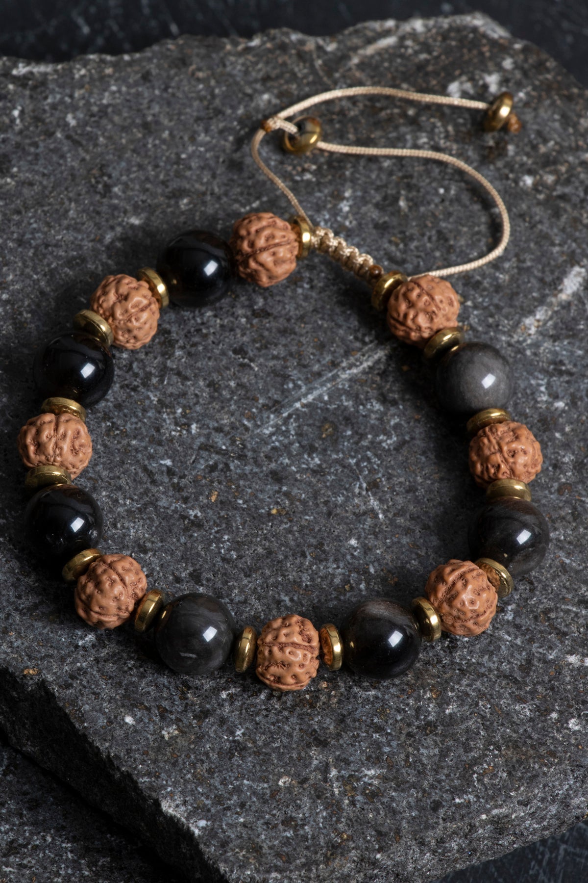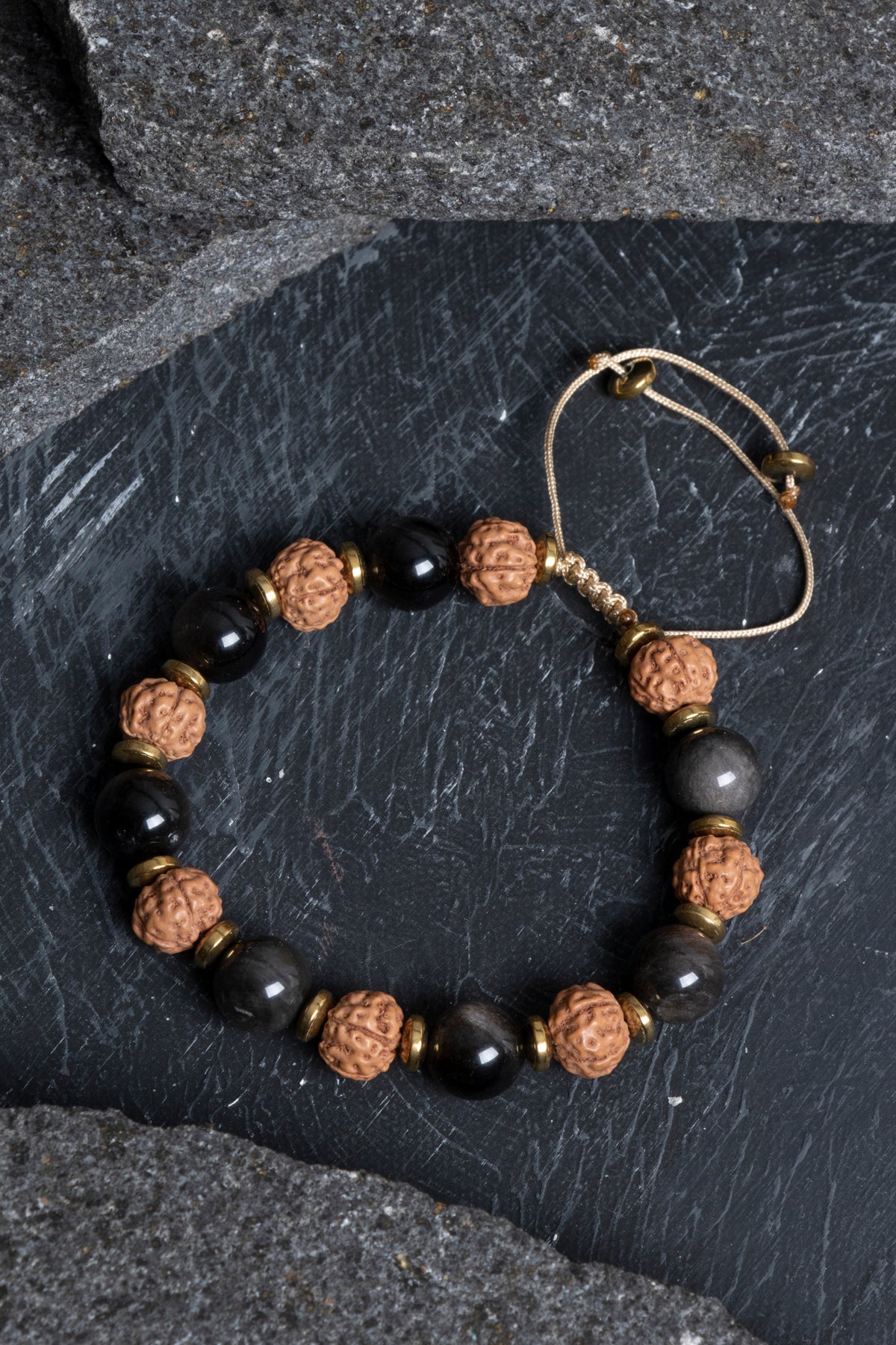 Obsidyen ve Rudraksha Doğal Taş Makrome Bileklik – Ayarlanabilir El Yapımı Tasarım