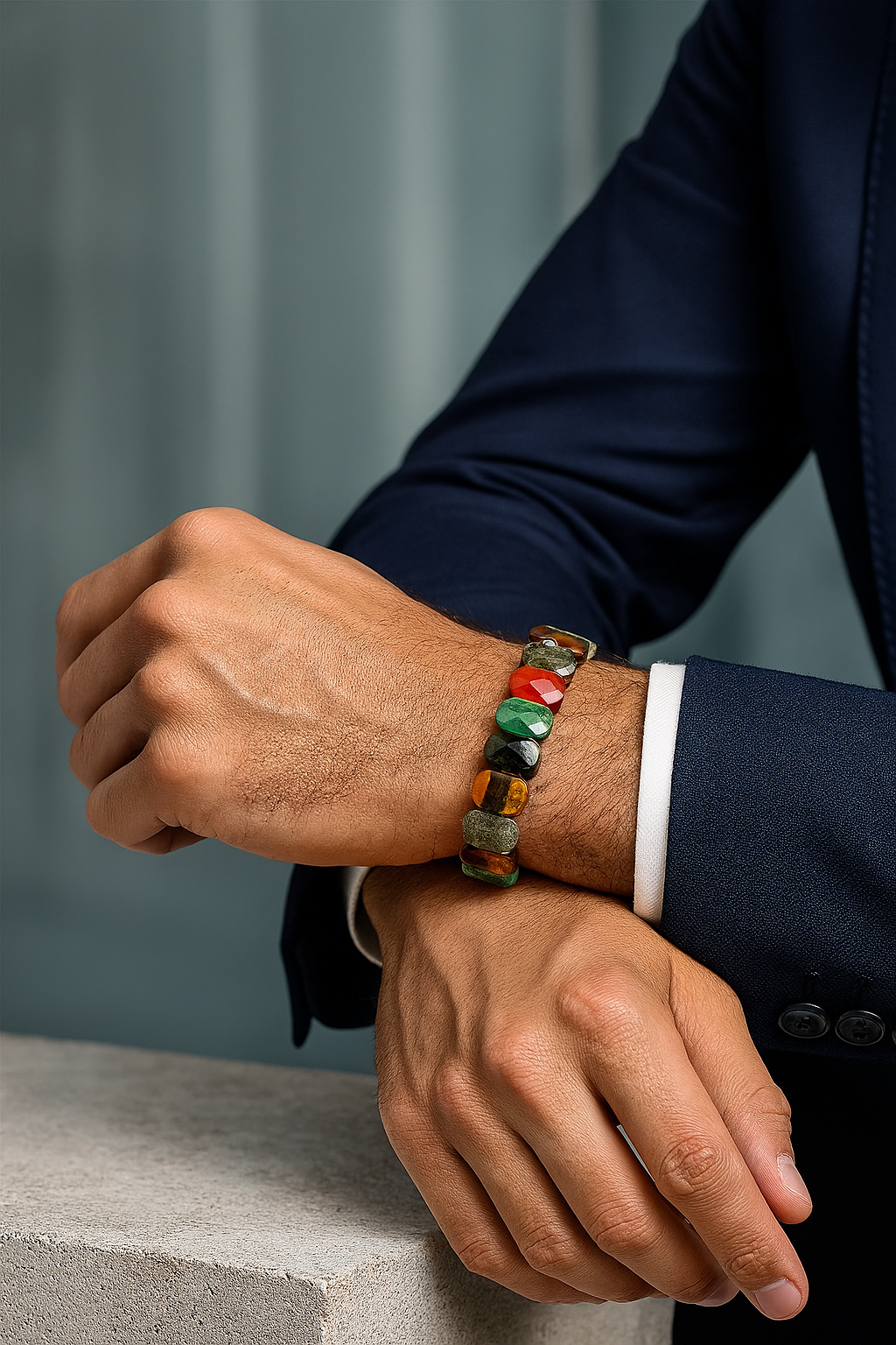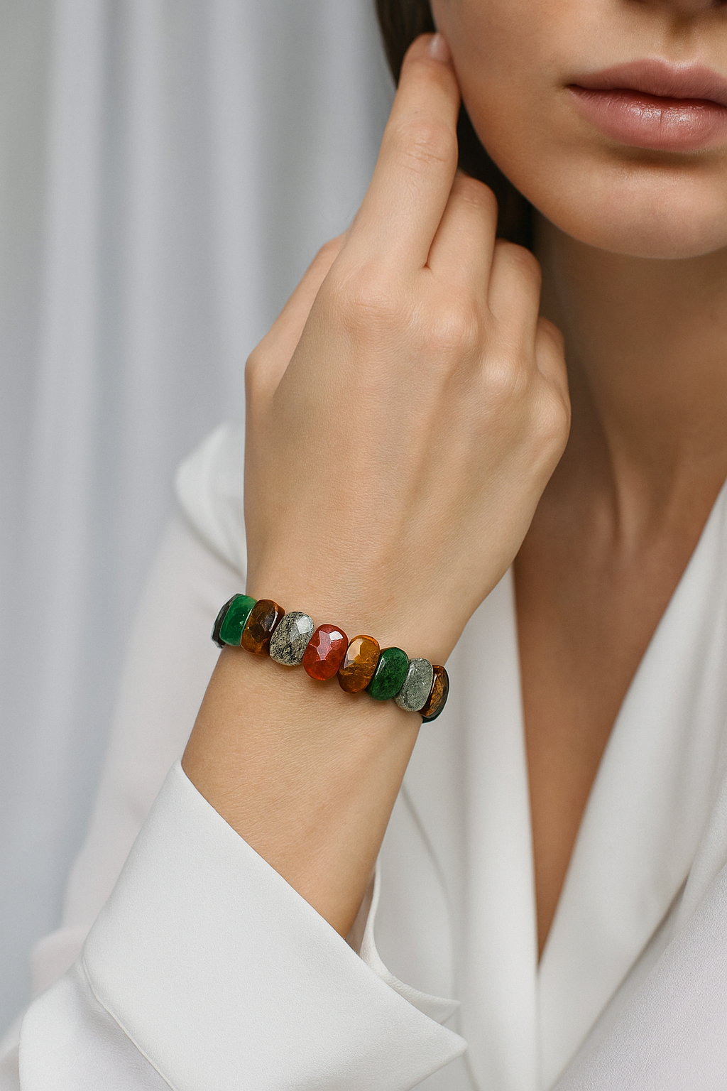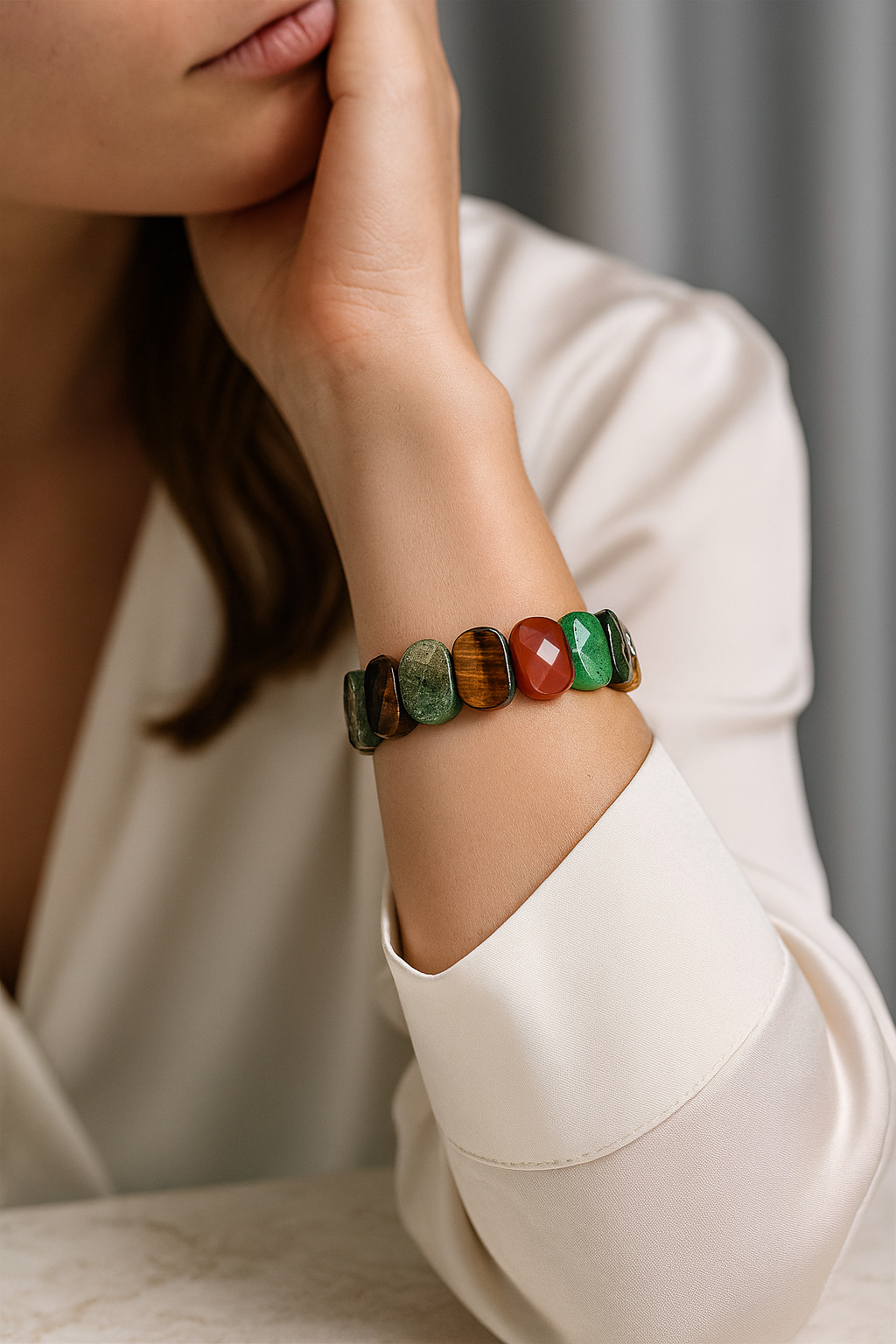 Kırmızı Akik’in kararlı enerjisi, Kaplan Gözü’nün güçlü duruşu, Yeşim’in dengeli doğası, Aventurin’in huzurlu yeşil tonu ve Labradorit’in gizemli ışık oyunları bu özel tasarımda buluştu.