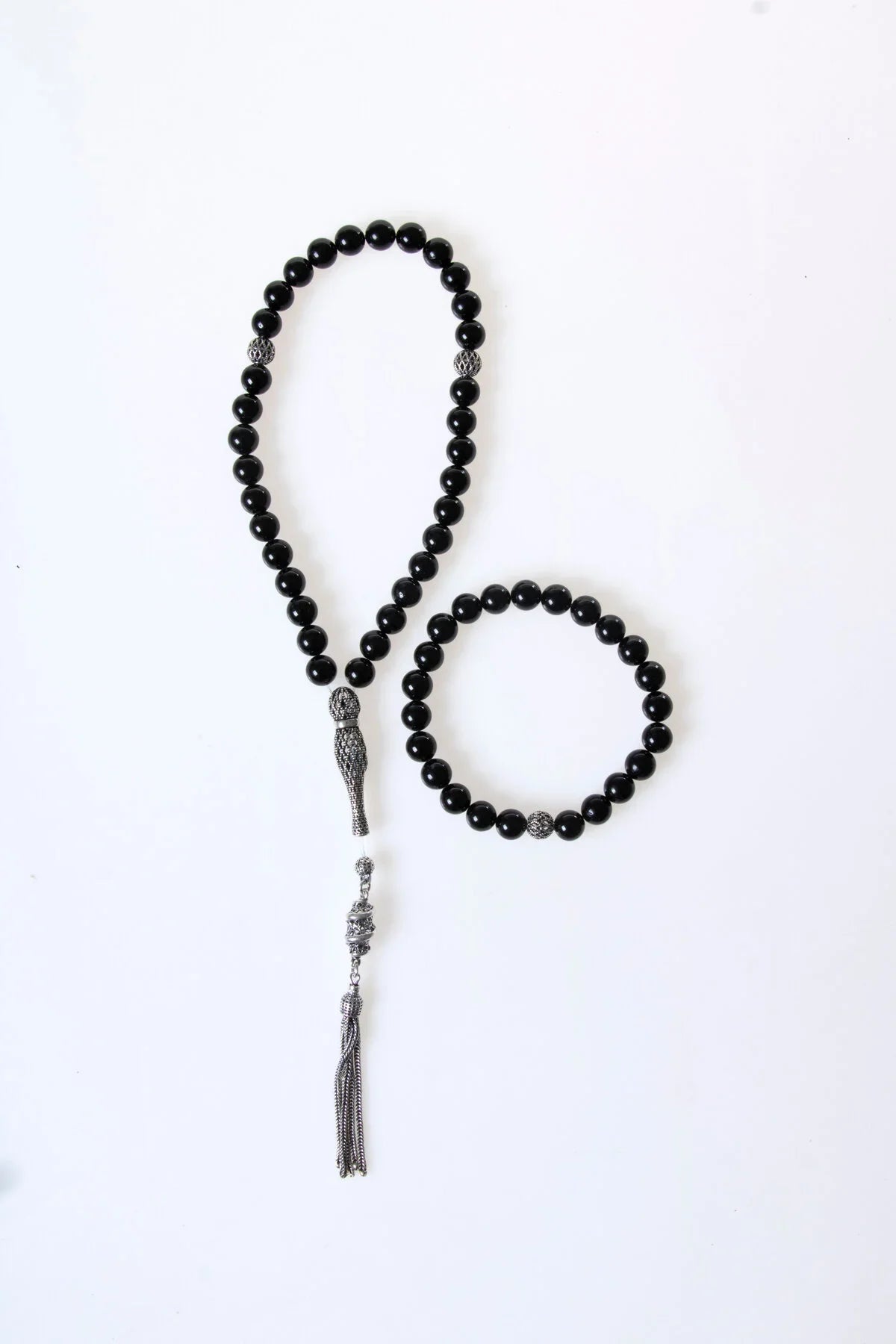 Sertifikalı Turmalin Doğaltaş 925 Ayar Gümüş 8 mm İmameli Tesbih & Bileklik Seti