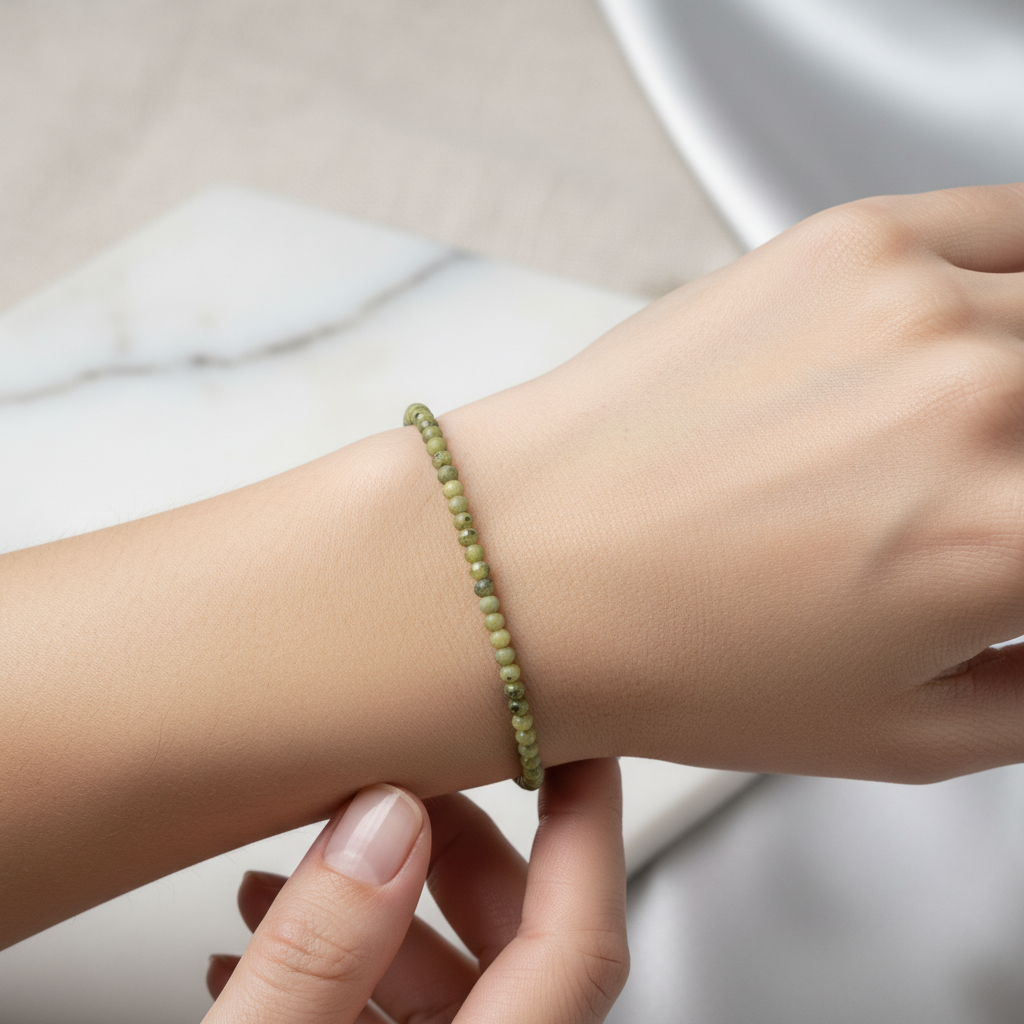 Yumuşak yeşil tonlarıyla doğanın huzur veren enerjisini taşıyan Yeşim ve Serpantin taşları, bu zarif bileklikte bir araya geliyor. 4 mm yuvarlak (küre) kesim formunda hazırlanan bu özel bileklik, minimal tasarımı ve doğal taşların sakin renk geçişleriyle hem sade hem de etkileyici bir görünüm sunar.