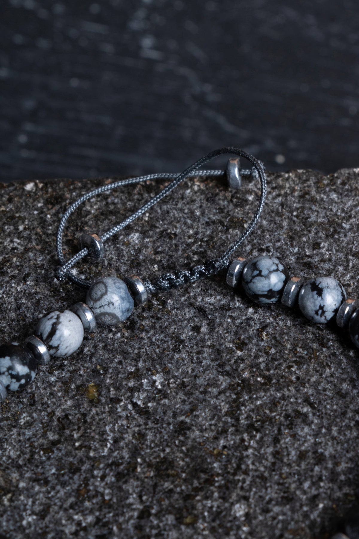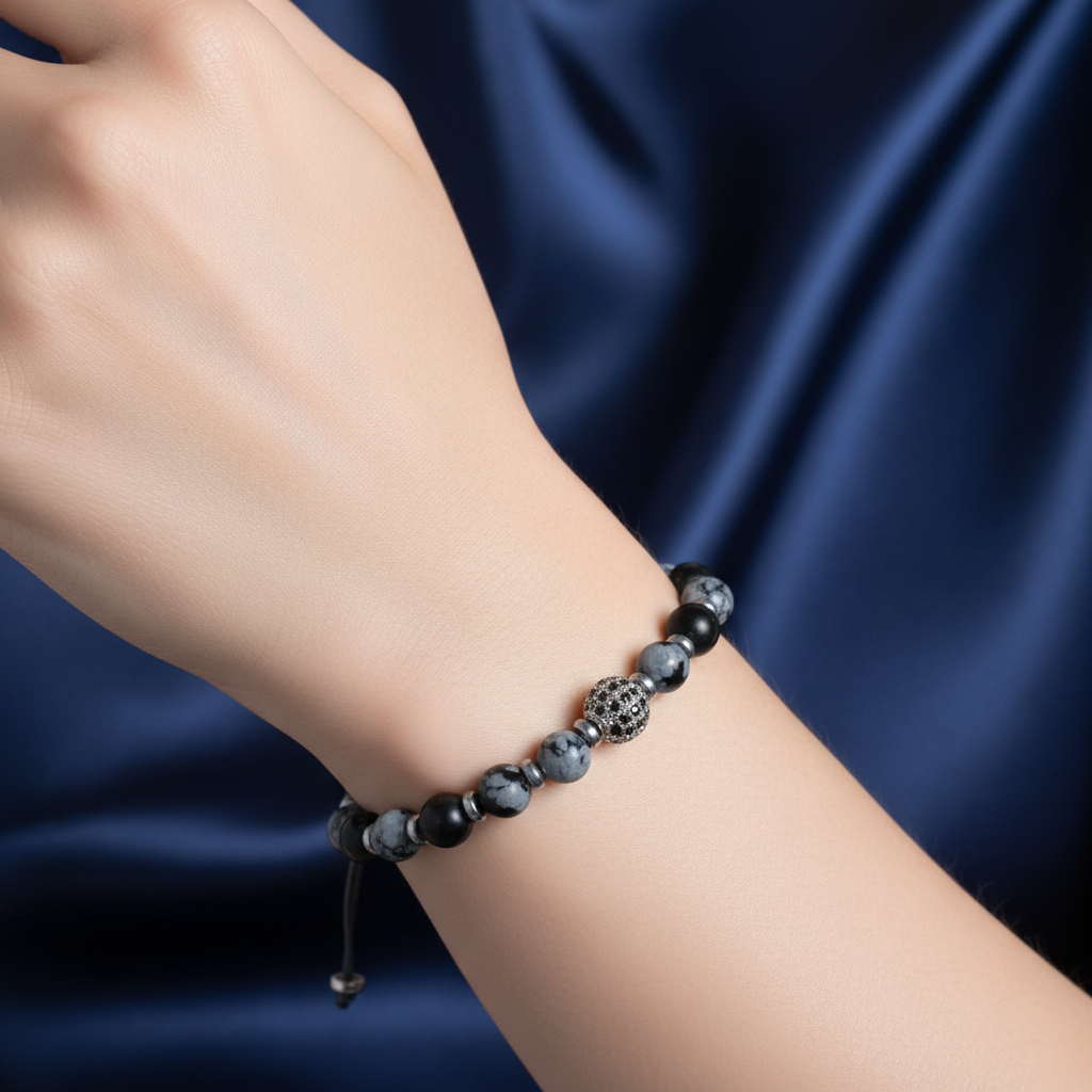 Obsidyen ve hematit taşlarının uyumuyla tasarlanan bu doğal taş makrome bileklik, zirkon aparat detayıyla modern ve zarif bir görünüm kazanır. El işçiliğiyle özenle hazırlanan dayanıklı makrome örgü, hem günlük kullanımda hem de özel günlerde şıklığınızı tamamlayan estetik bir aksesuardır.