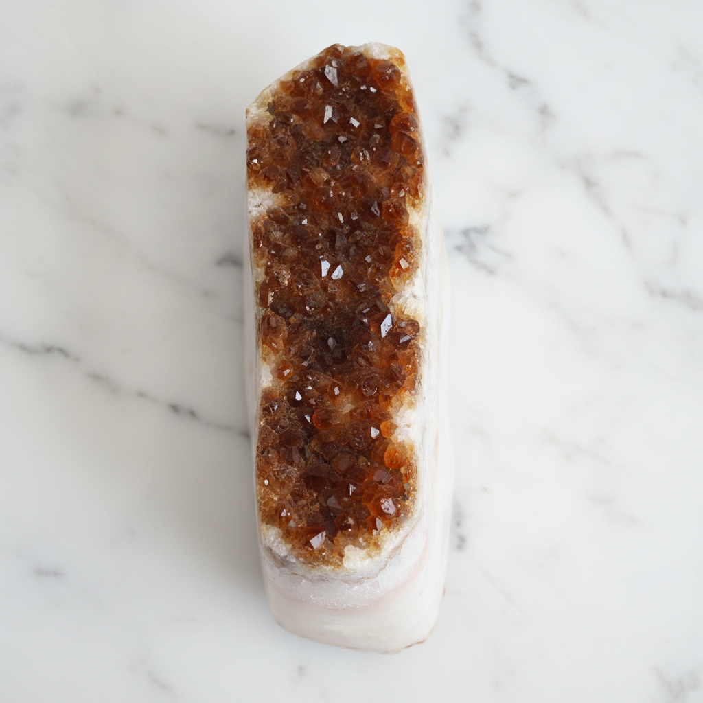 The crystal clusters on its surface create a warm, vibrant glow when exposed to light. This stone, both a collector's item and a standout in decorative displays, brings natural elegance to spaces.