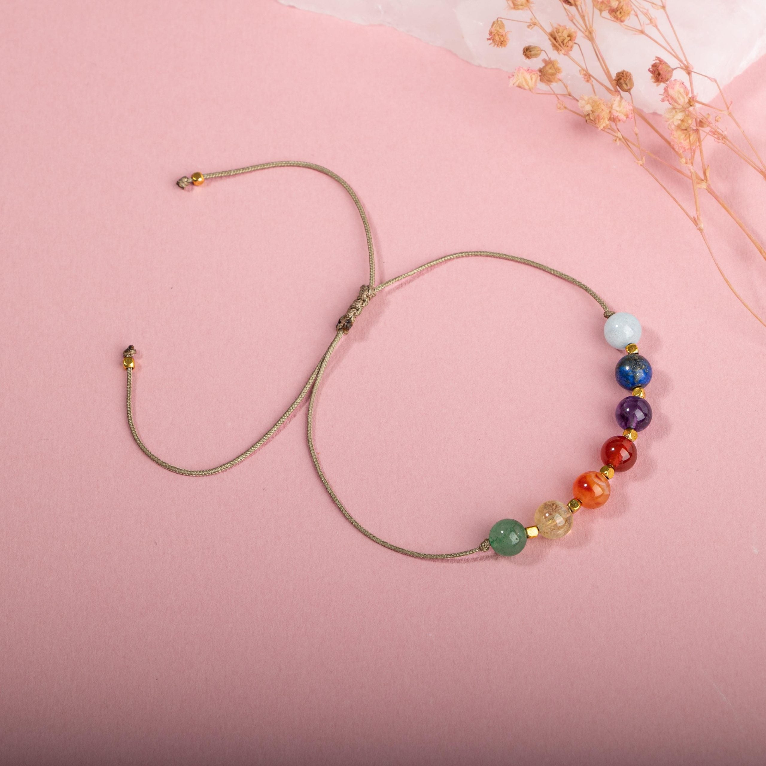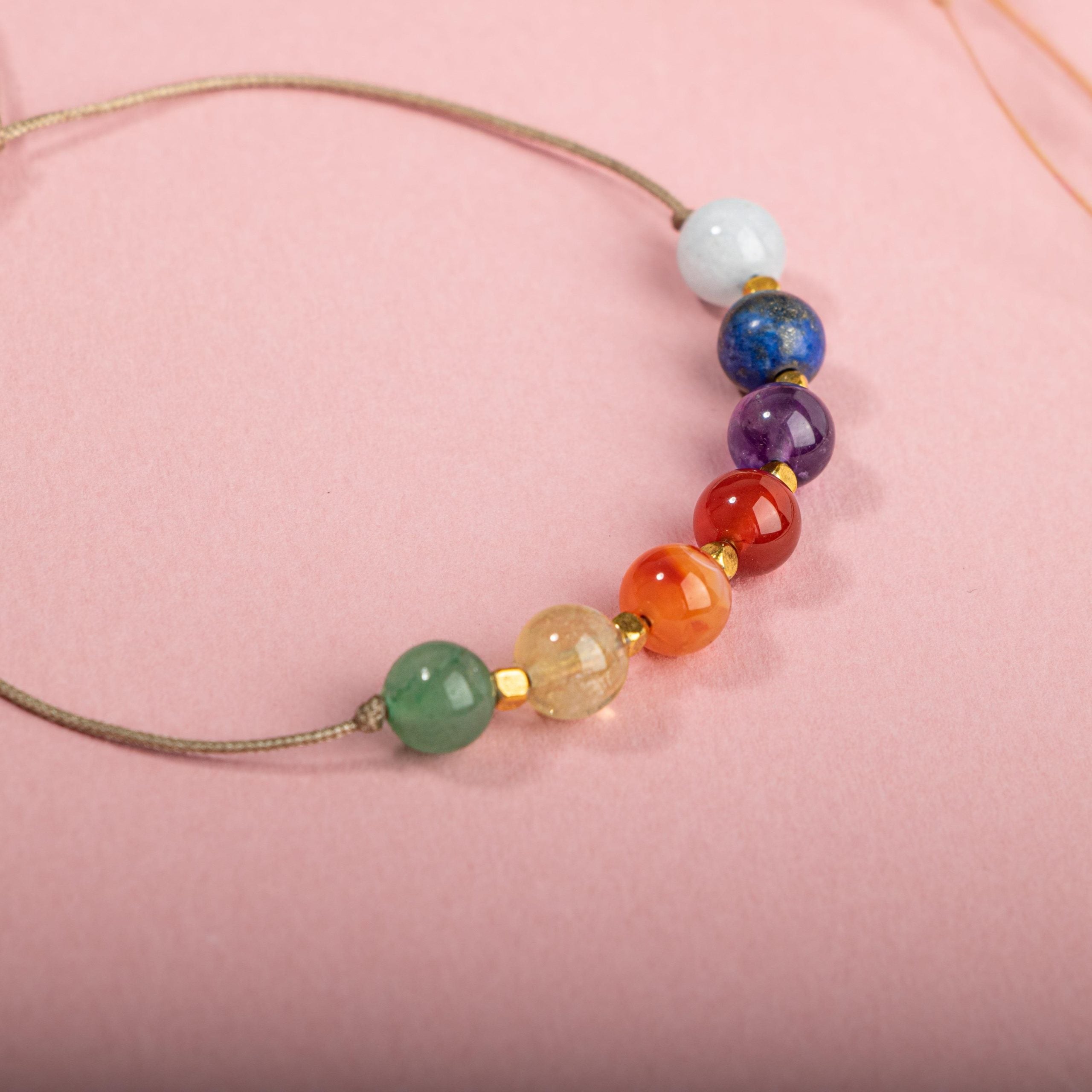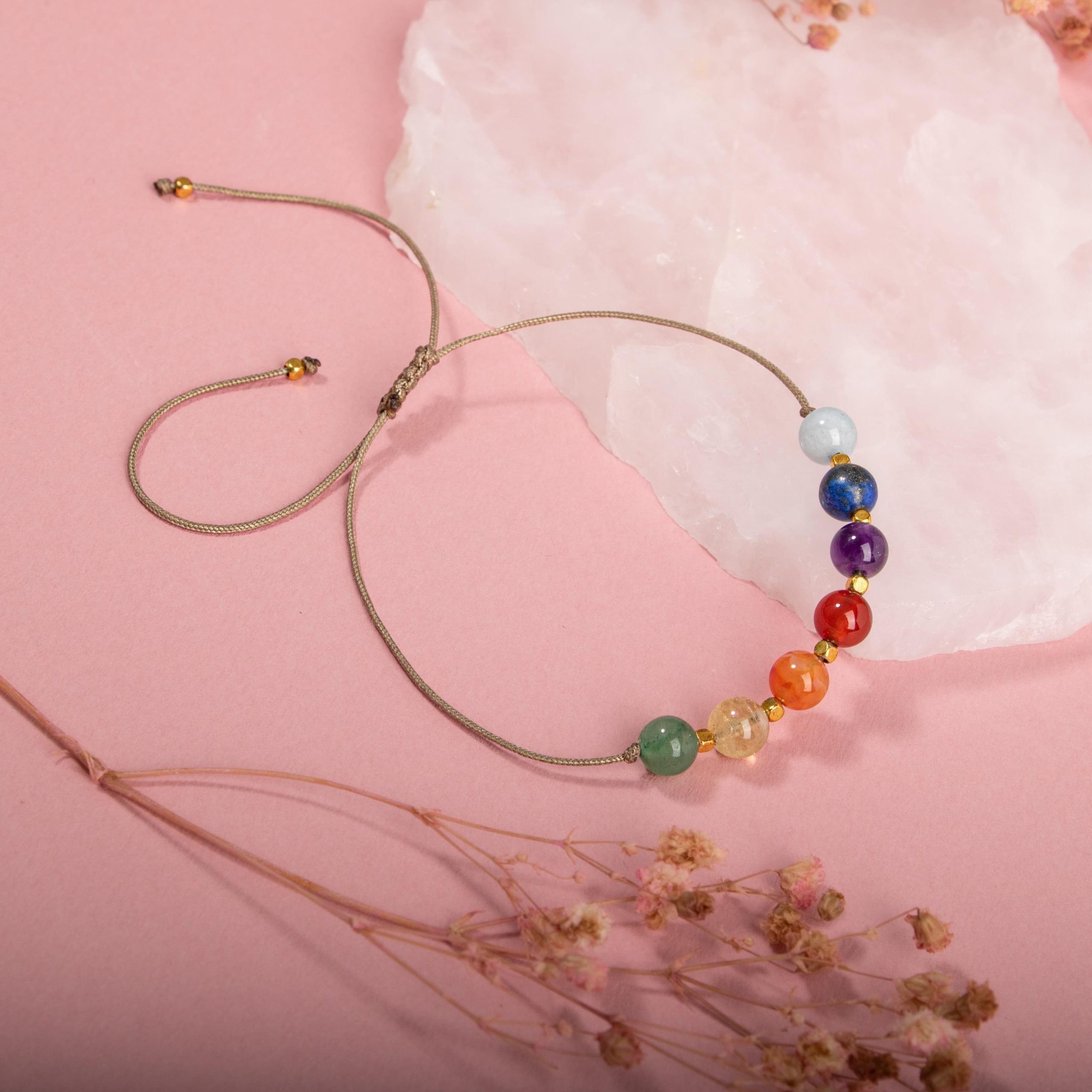Farklı doğal taşların renkli uyumu, modern bir bileklik tasarımında bir araya geliyor. Akuamarinin ferahlatıcı mavisi, karnelyan akik taşının sıcak turuncu-kırmızı tonları, yeşil aventurinin doğal canlılığı, lapis lazulinin asil mavisi, sitrinin parlak sarısı, ametistin mor zarafeti ve kırmızı akik taşının derin rengi el işçiliğiyle hazırlanmış bu tasarımda buluşuyor. Günlük kombinlerde dinamik bir şıklık, özel günlerde ise sofistike bir tamamlayıcı sunar.