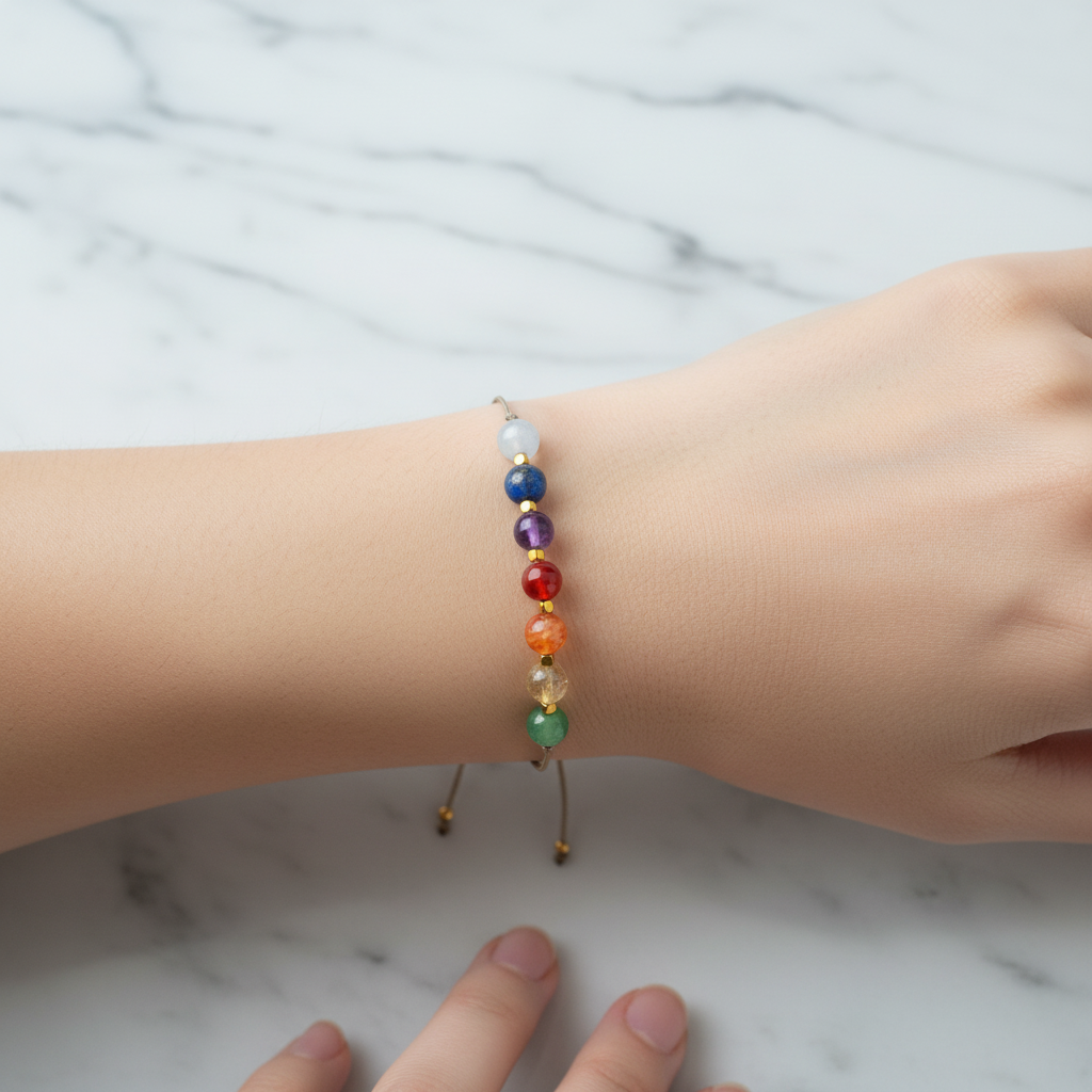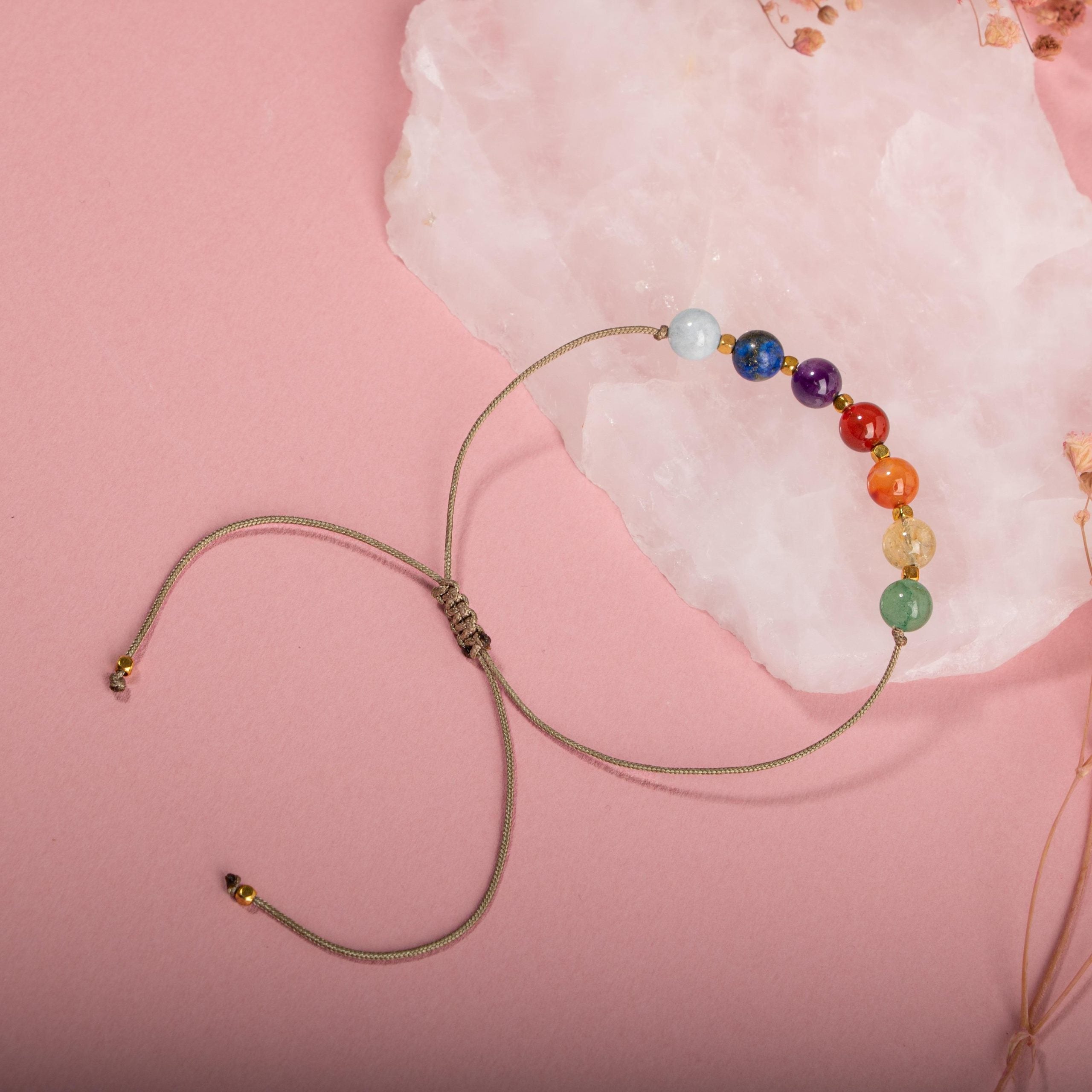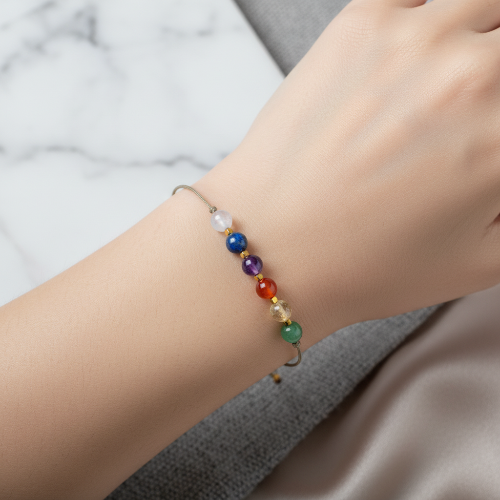 Farklı doğal taşların renkli uyumu, modern bir bileklik tasarımında bir araya geliyor. Akuamarinin ferahlatıcı mavisi, karnelyan akik taşının sıcak turuncu-kırmızı tonları, yeşil aventurinin doğal canlılığı, lapis lazulinin asil mavisi, sitrinin parlak sarısı, ametistin mor zarafeti ve kırmızı akik taşının derin rengi el işçiliğiyle hazırlanmış bu tasarımda buluşuyor. Günlük kombinlerde dinamik bir şıklık, özel günlerde ise sofistike bir tamamlayıcı sunar.