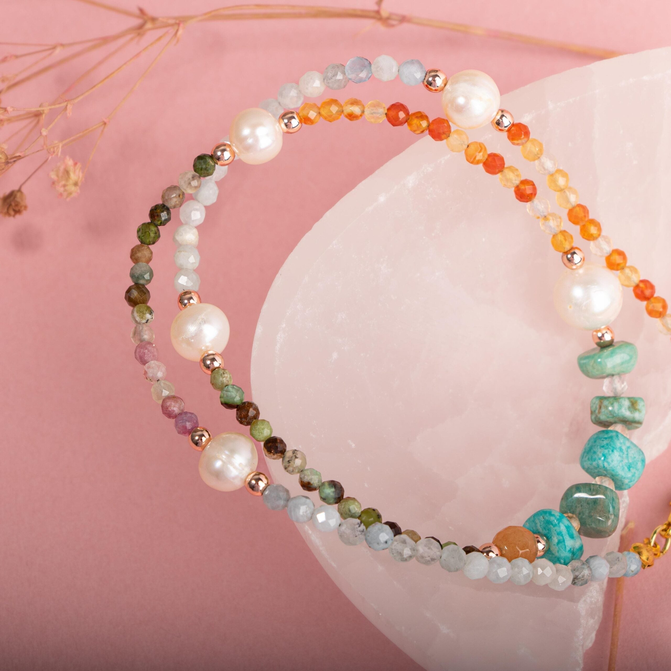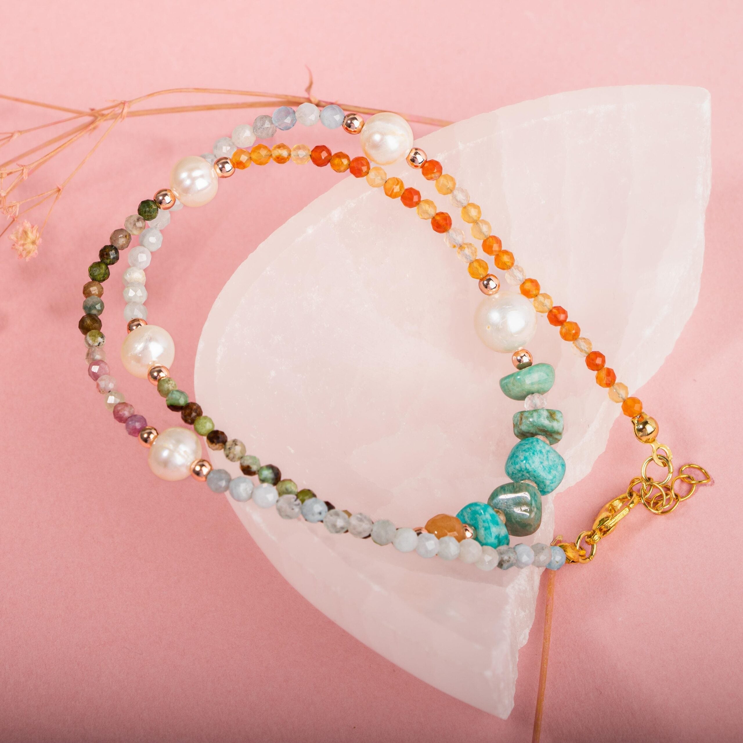 Taşlar: İnci, Amazonit, Turuncu Aventurin, Karnelyan Akik, Akuamarin, Renkli Turmalin, Krizopras (doğal taş)
