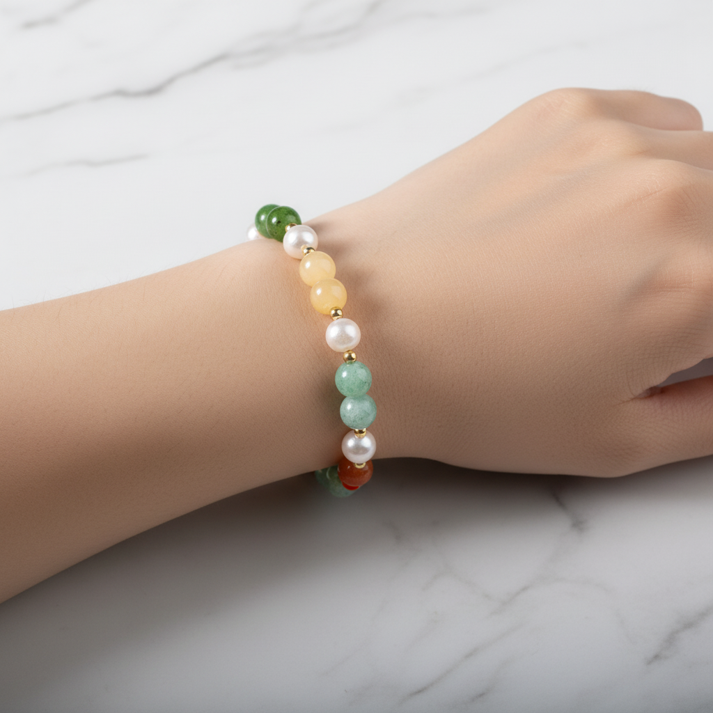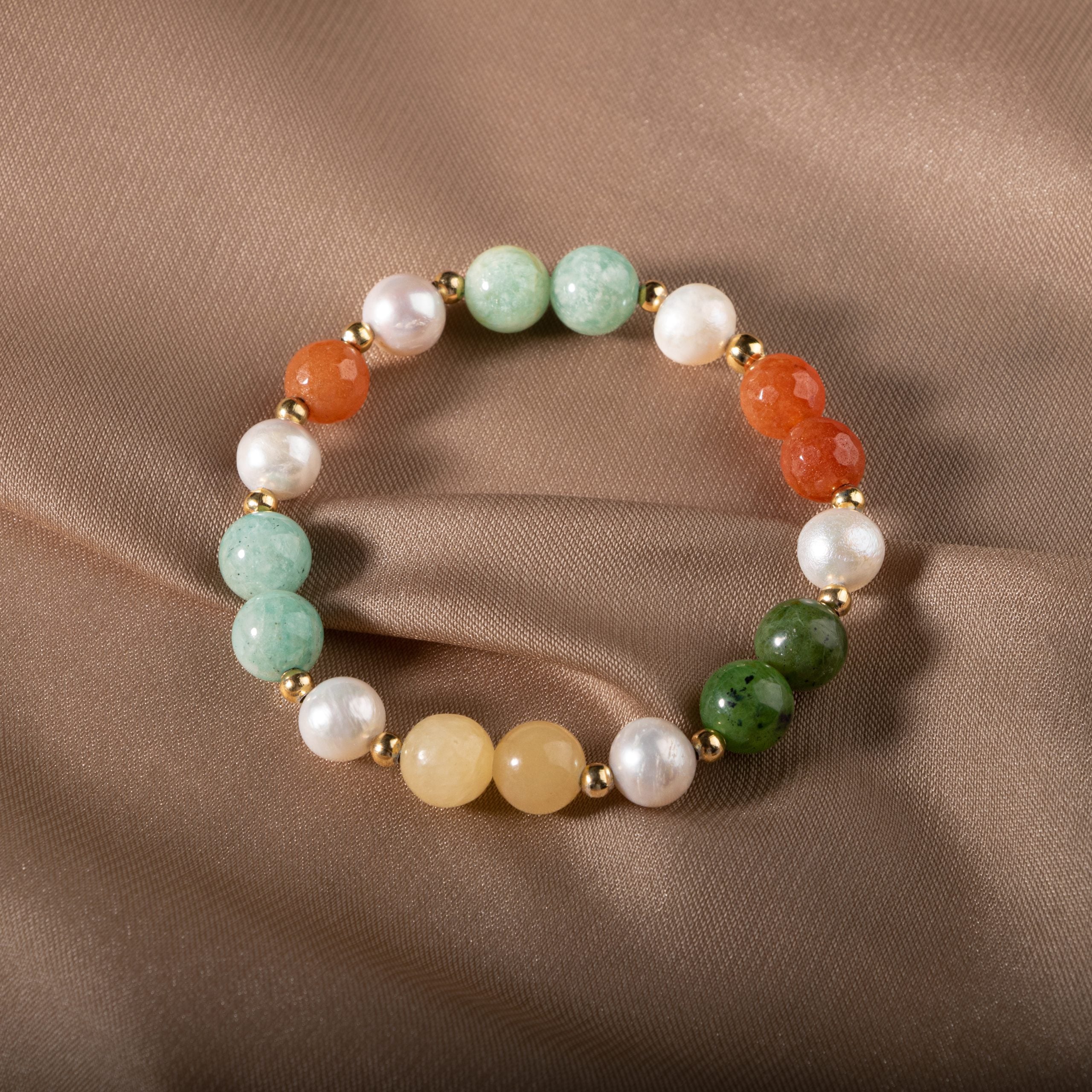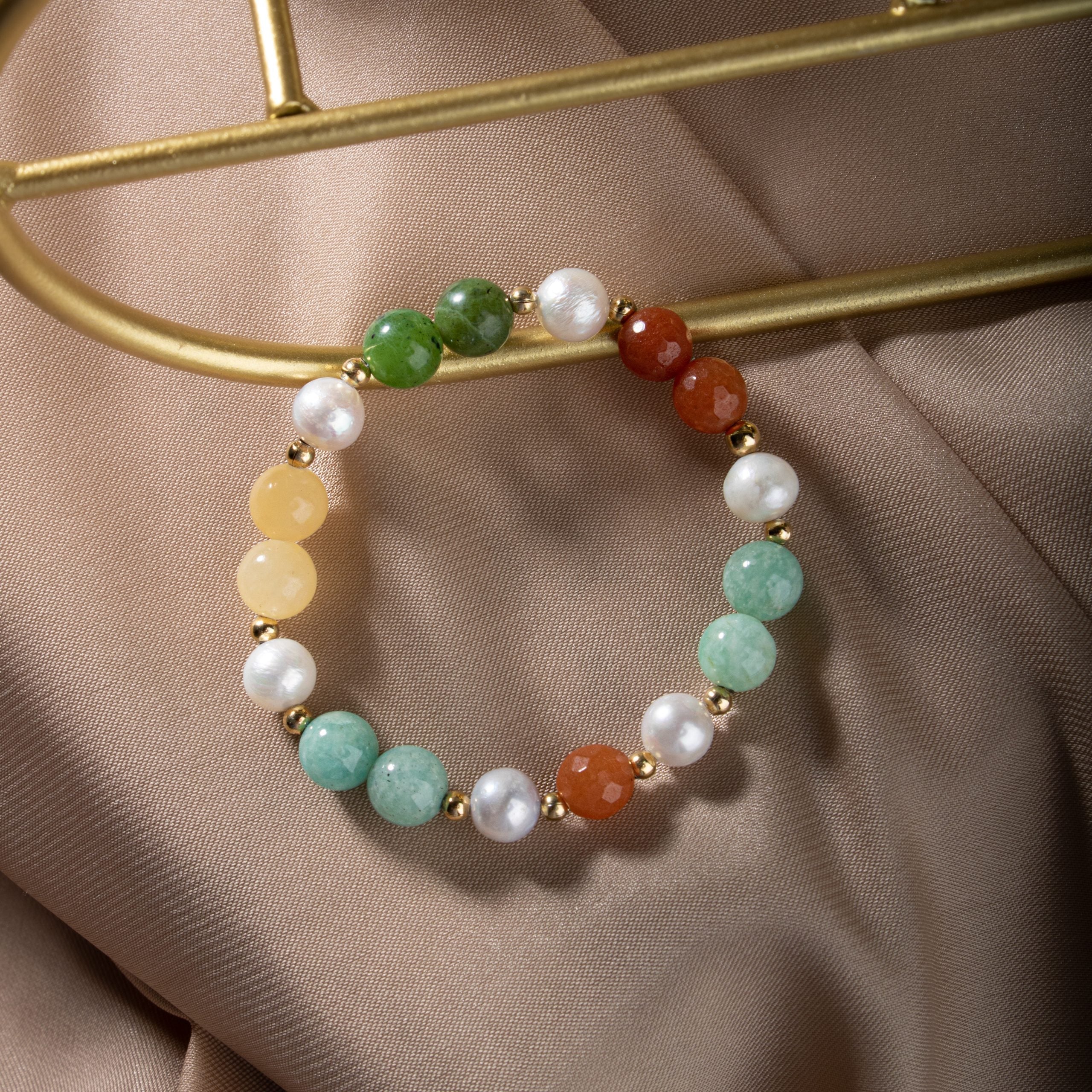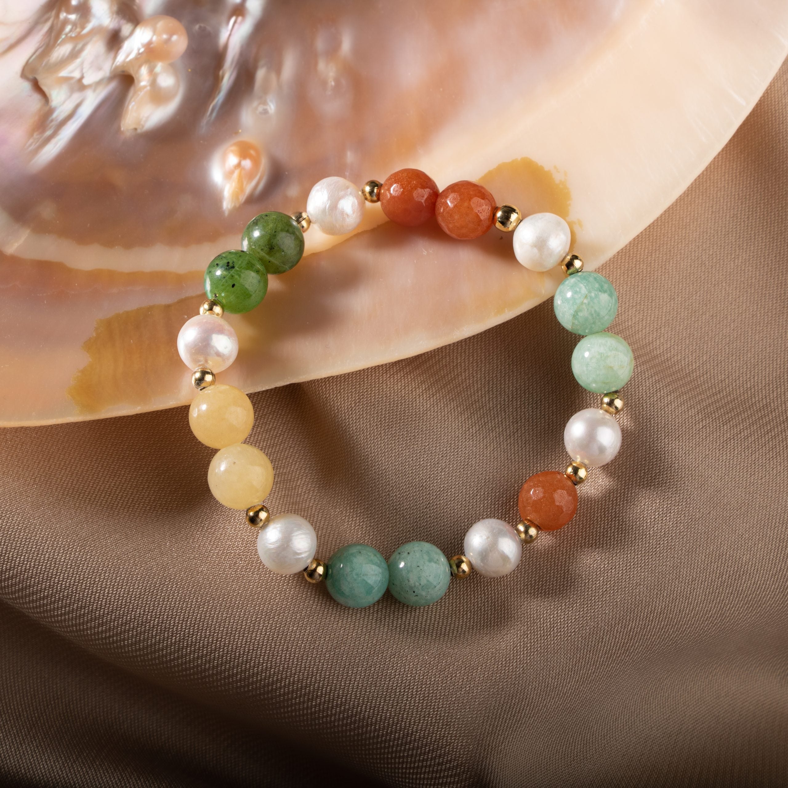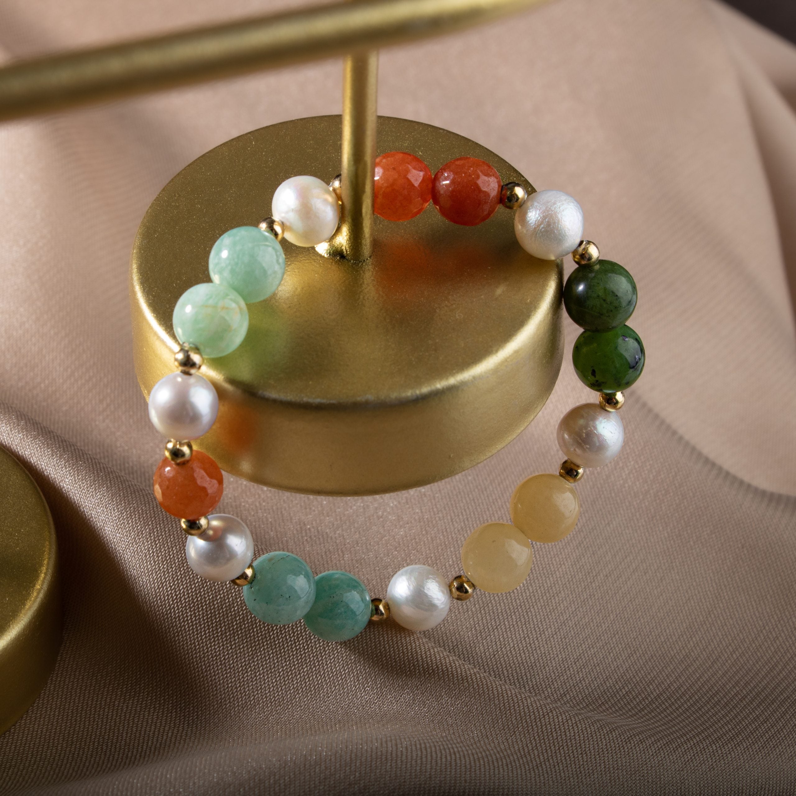 Farklı doğal taşların estetik uyumunu bir araya getiren bu özel tasarım bileklik, inci zarafeti, turuncu aventurinin canlı ışıltısı, amazonitin dingin tonları, yeşimin doğal enerjisi ve kalsitin sofistike görünümüyle dikkat çeker. 925 ayar gümüş detaylarla tamamlanan bileklik, günlük kullanımda modern bir şıklık, özel davetlerde ise zarif bir tamamlayıcı sunar.