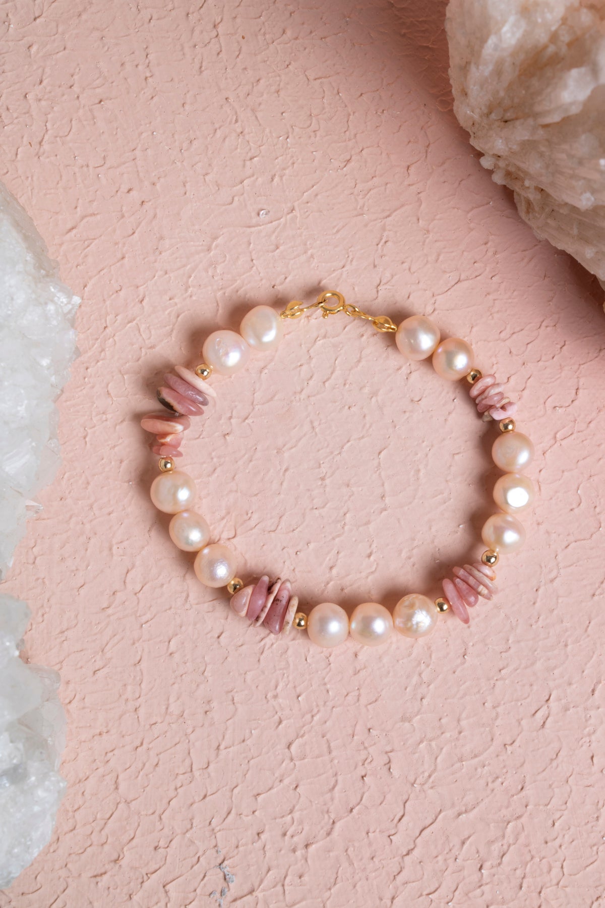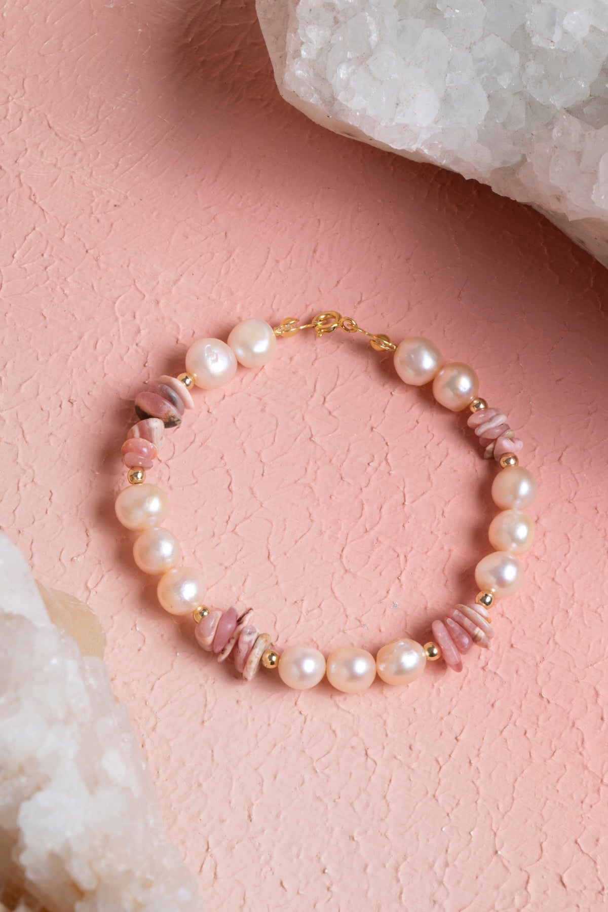 Rodokrozit ve incinin zarif uyumuyla tasarlanan bu gümüş bileklik, şıklığı ve el işçiliğiyle dikkat çeker. Doğal taşların özgün dokusu, gümüş detaylarla birleşerek modern ve estetik bir görünüm kazandırır.