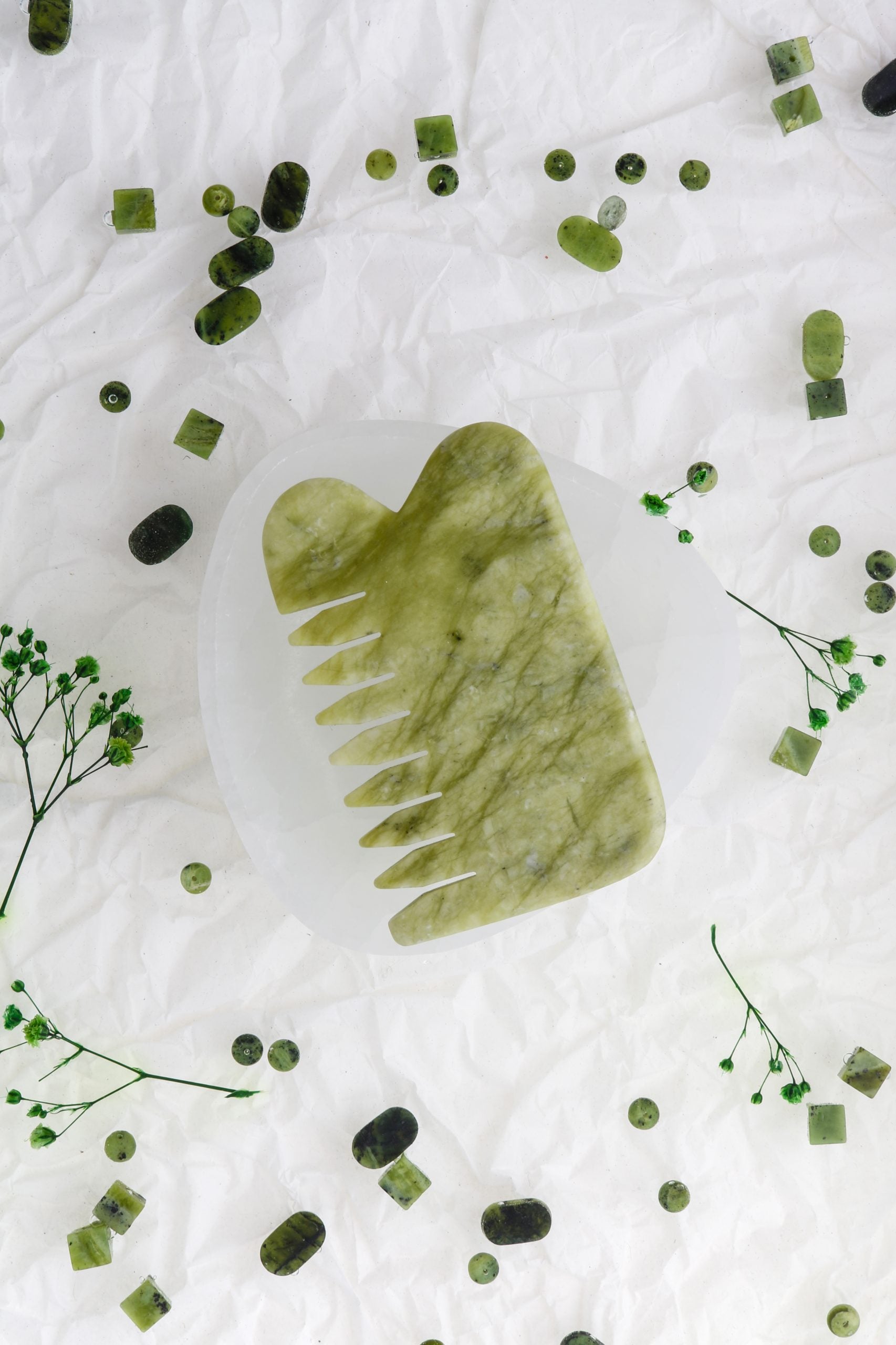 Yeşim taşının doğal serinliğini ve ferahlatıcı etkisini sunan bu Gua Sha tarak; cilt ve saç bakımında doğallık arayanlar için hem işlevsel hem de estetik bir seçimdir.