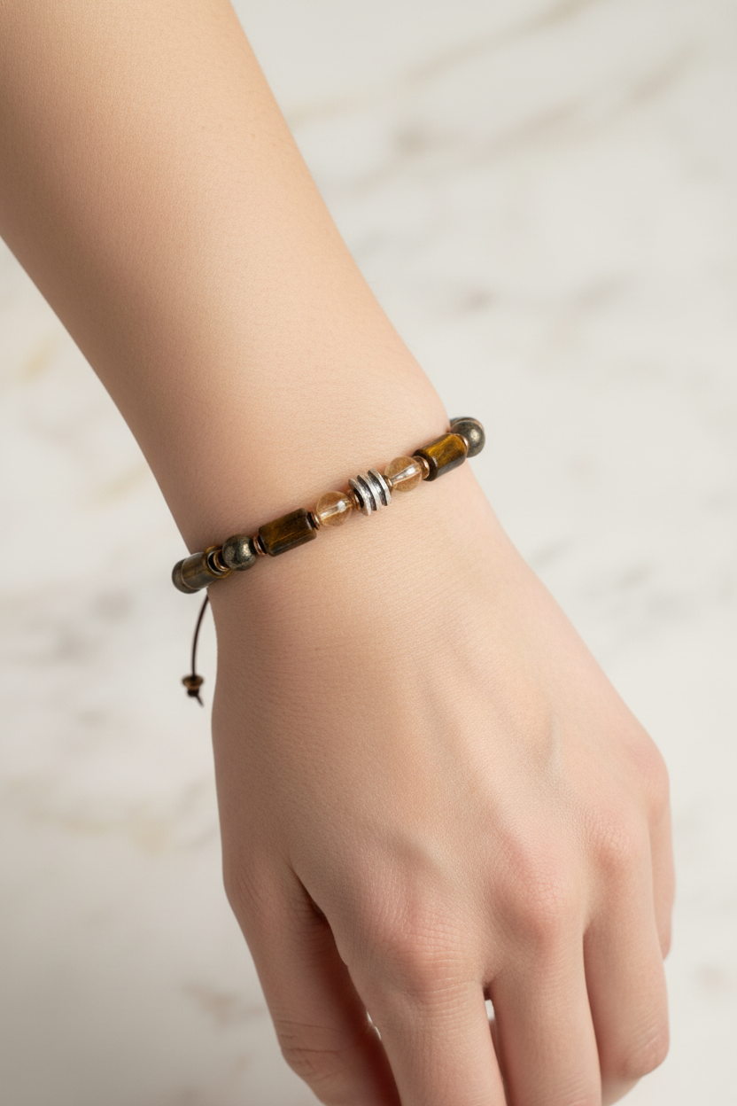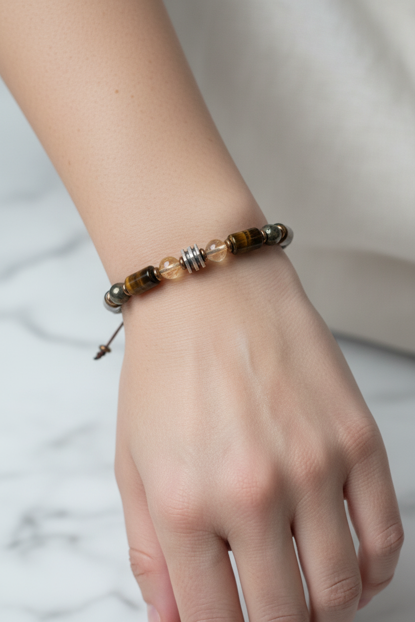 Kaplan gözünün enerjik ışıltısını, sitrinin sıcak parlaklığını, piritin güçlü tonlarını ve hematitin metalik parlaklığını buluşturan bu 6 mm ipli ayarlanabilir bileklik; koleksiyonuna modern, karakterli ve zarif bir parça eklemek isteyenler için ideal seçimdir.