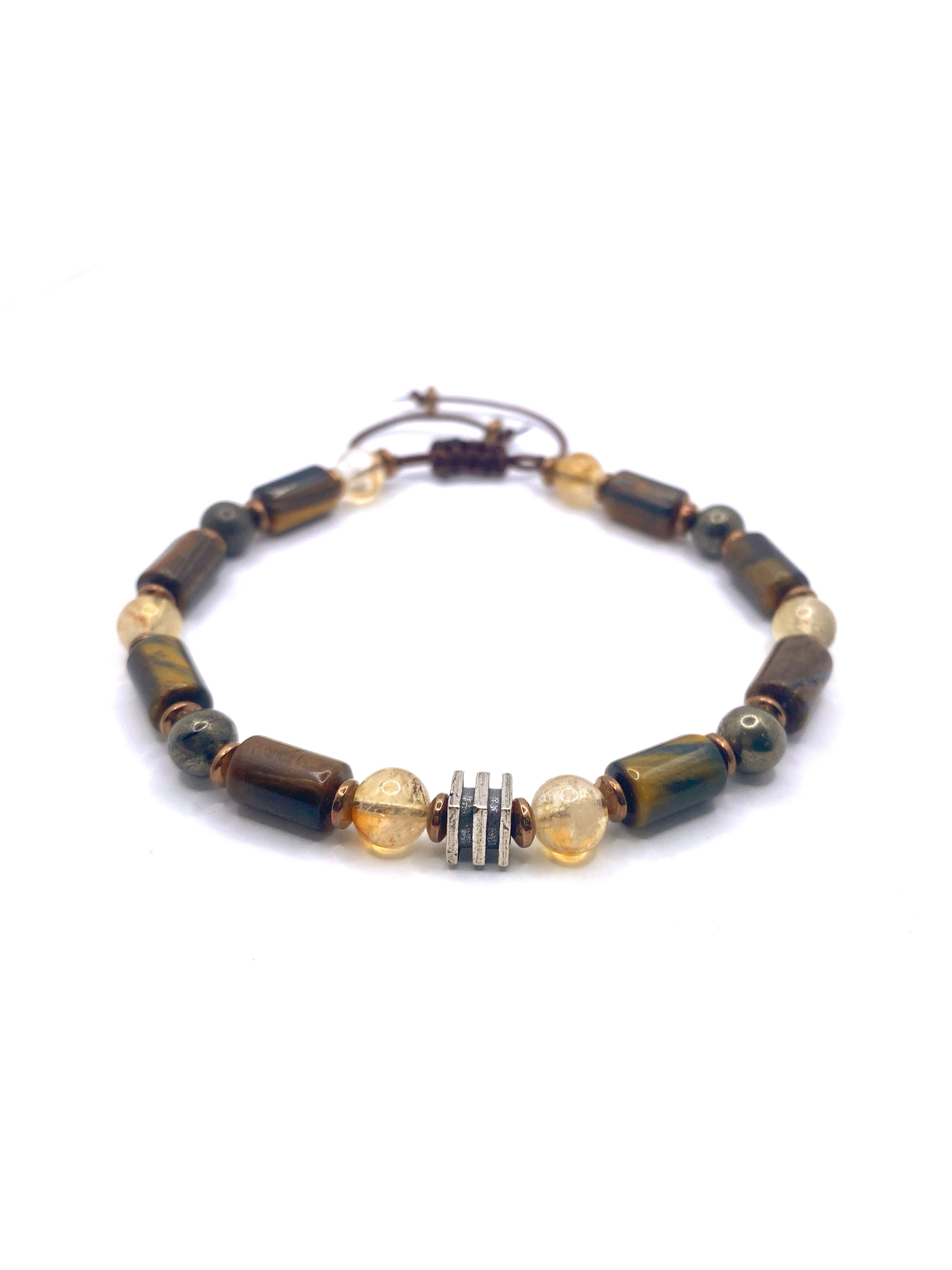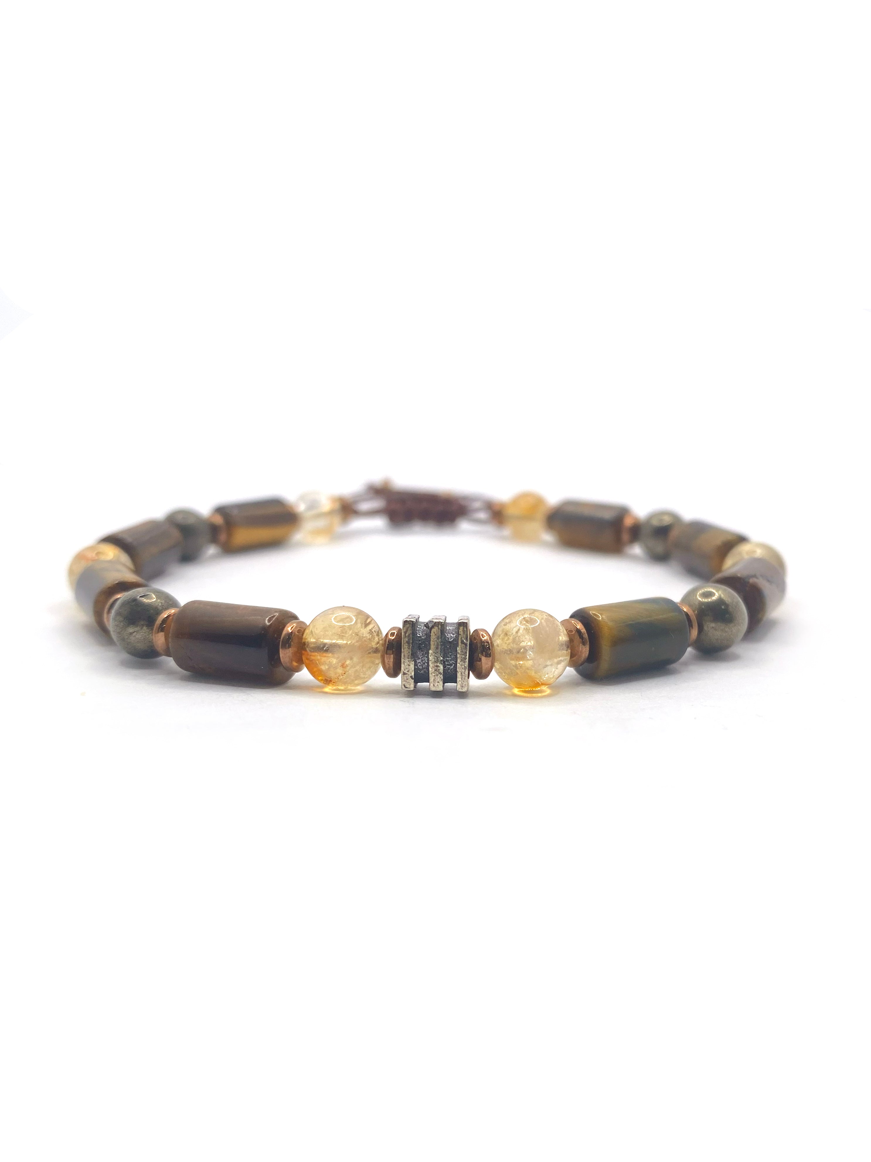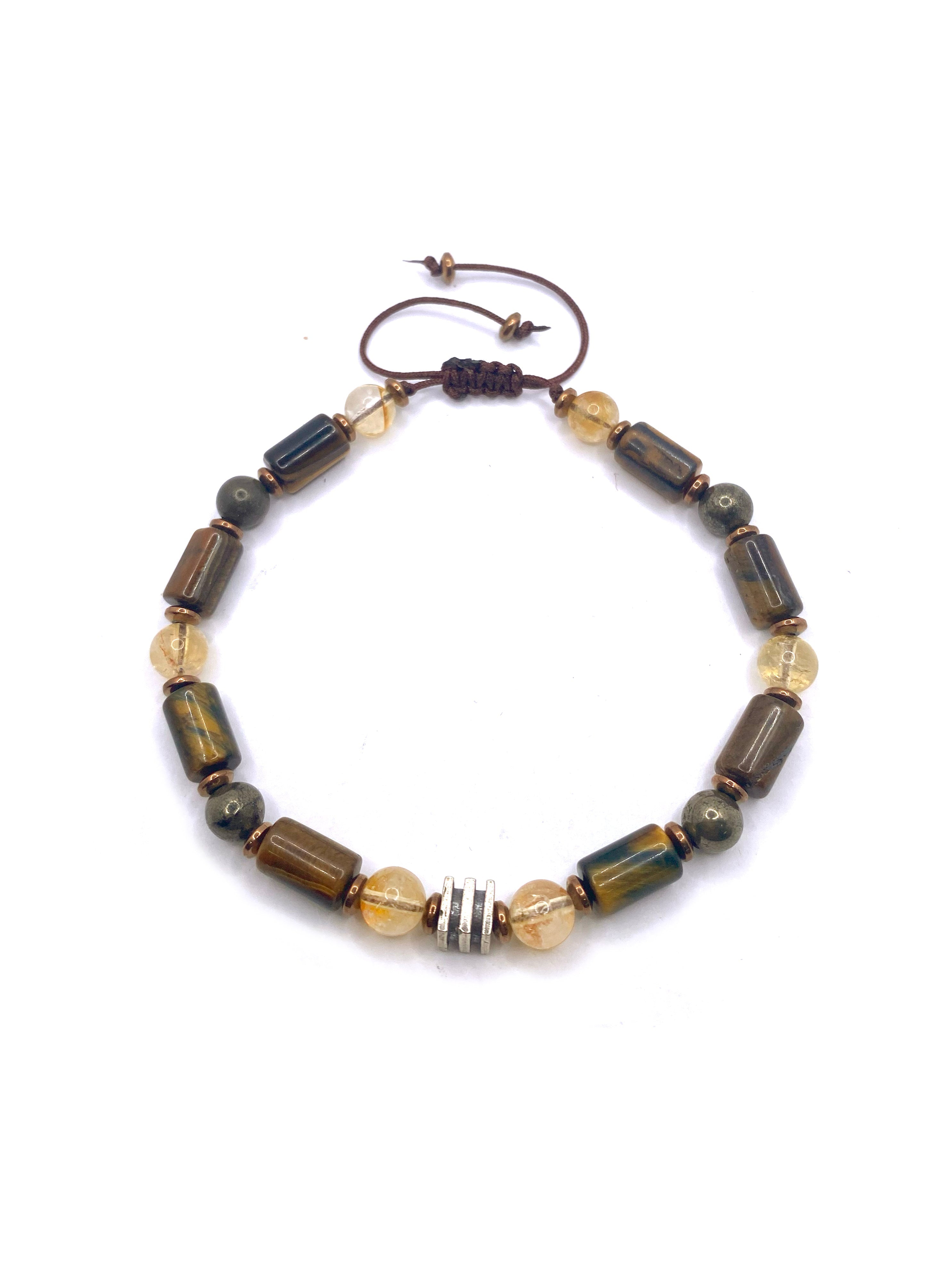 Kaplan gözünün altın-kahverengi yansımaları, sitrinin sıcak bal sarısı parlaklığı, pirit taşının metalik altın tonları ve hematitin gri ışıltısı bu bileklikte güçlü bir uyum oluşturuyor. 6 mm doğal taşlarla hazırlanan ipli ayarlanabilir tasarım, hem sağlam hem de konforlu bir kullanım sunar. Günlük kombinlerde doğal bir şıklık, özel günlerde ise sofistike bir tamamlayıcı aksesuar olarak öne çıkar.