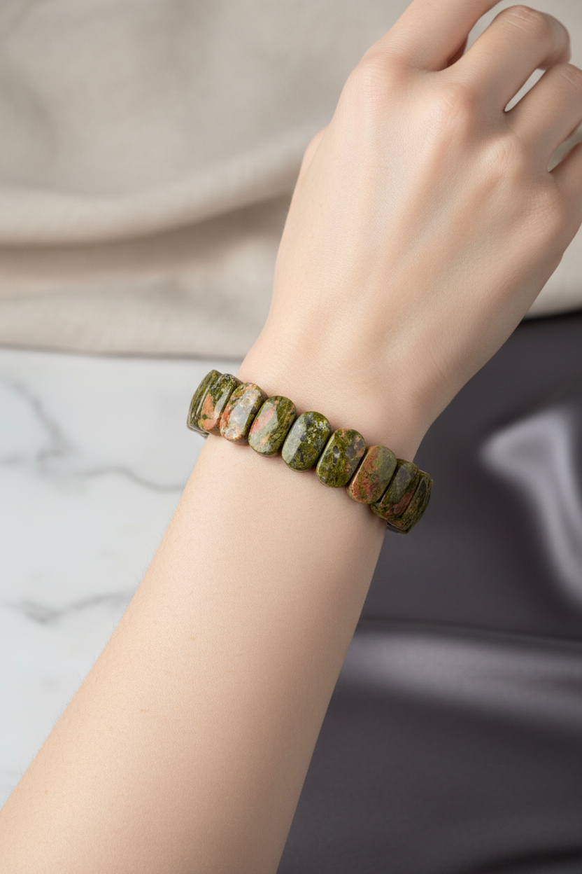Yeşil ve pembe tonlarının doğal uyumunu yansıtan Unakit Doğal Taş Geniş Kesim Bileklik, zarif ve estetik tasarımıyla bileğinizde dikkat çeker. Geniş kesim doğal unakit taşları, özgün renk geçişleri sayesinde günlük kombinlerde doğal bir şıklık, özel anlarda ise sofistike bir tamamlayıcı aksesuar olarak öne çıkar.