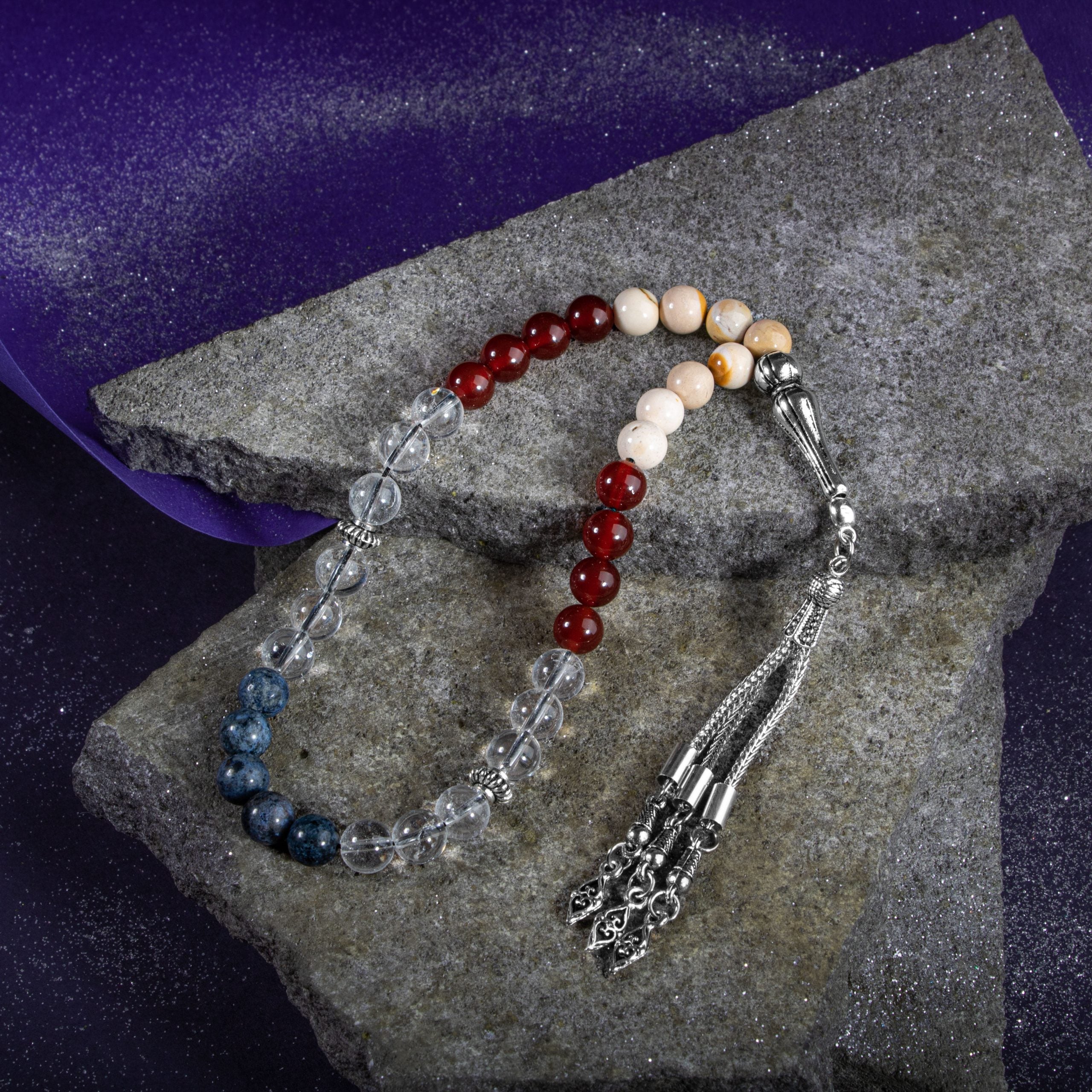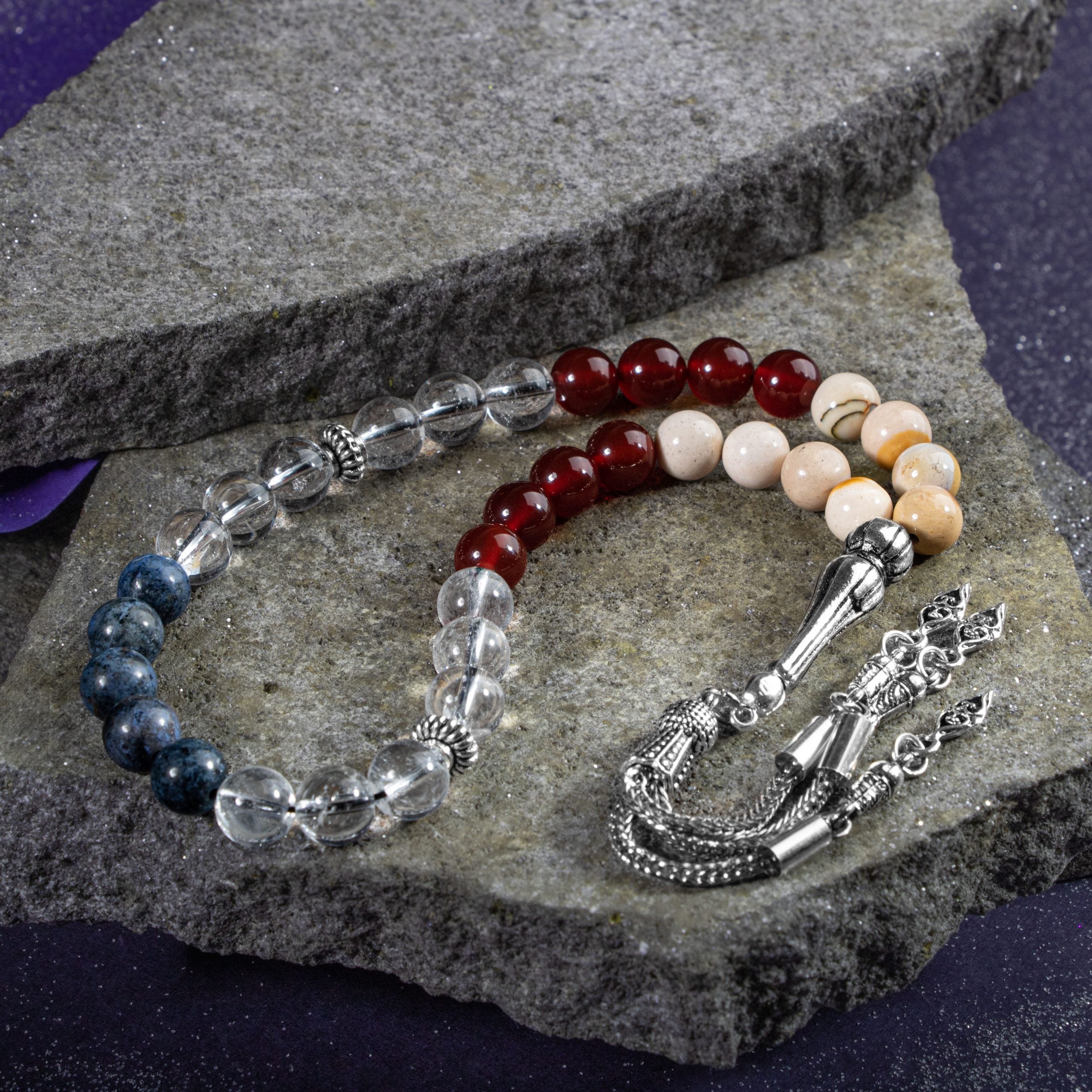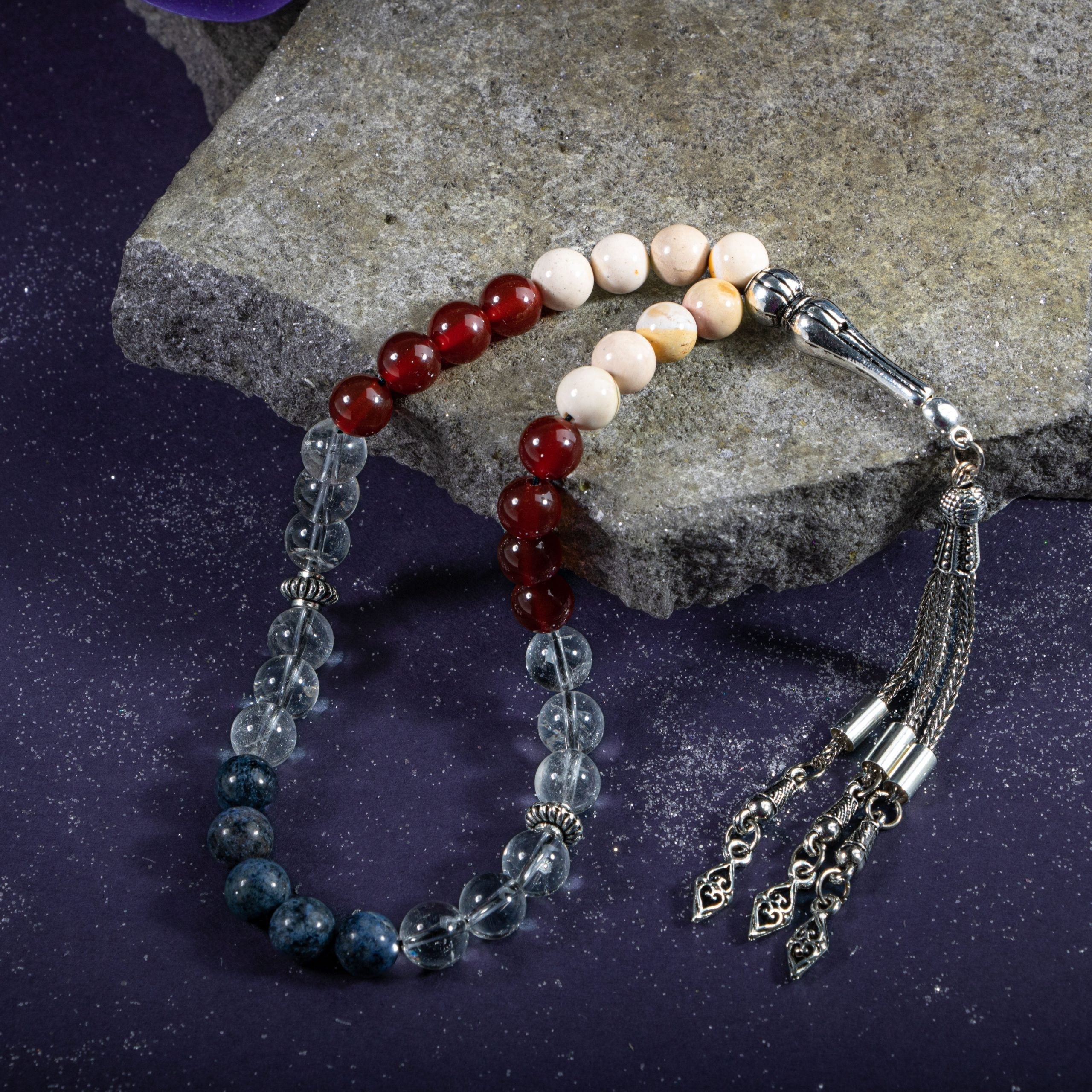 Oğlak Burcu Tesbih – Dumortierit, Jasper, Kırmızı Akik & Kristal Kuvars Doğal Taş – Özel Tasarım