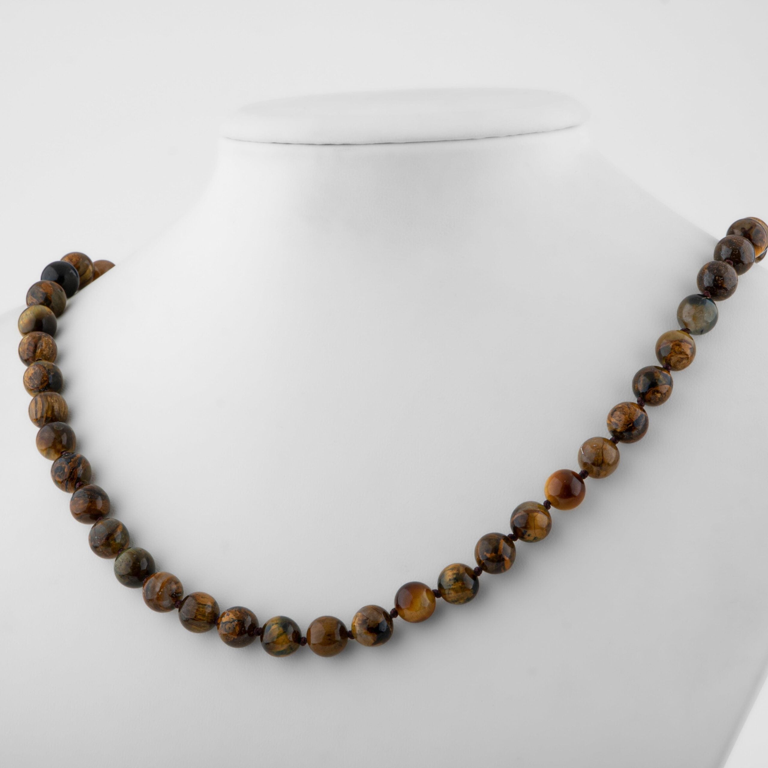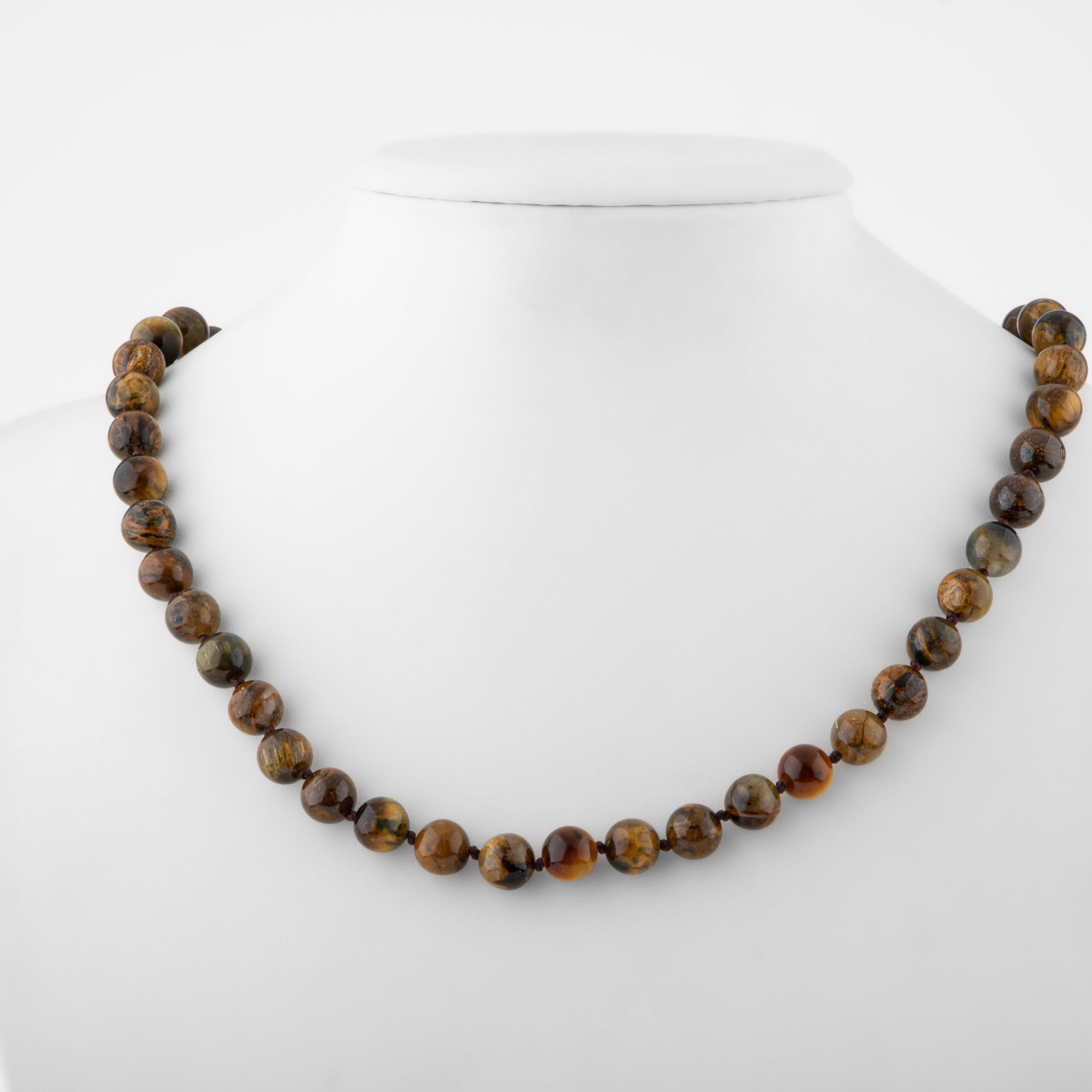 Pitersit taşının mavi, kahverengi ve altın tonlarının göz alıcı birleşimi, 8 mm boyutunda tek tek düğümlenerek şık bir kolye formunda tasarlandı. Doğal taşın ışığa göre değişen renk oyunları, ürüne hem güçlü hem de sofistike bir görünüm kazandırır. Düğümlü dizim tekniği taşların doğal yapısını ön plana çıkarırken, ürüne ekstra dayanıklılık katar.
