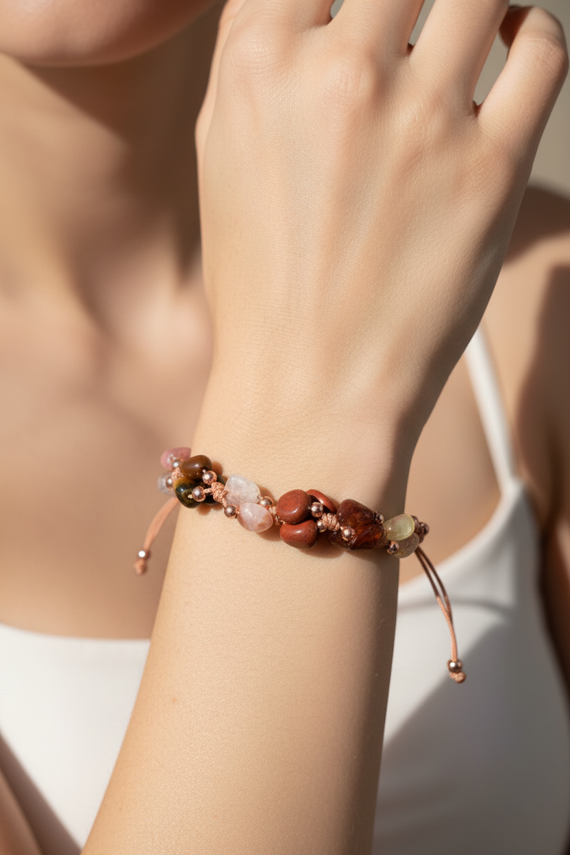 Güçlü iradesi, lider ruhu ve dikkat çekici enerjisiyle öne çıkan Aslan burcu için özel olarak tasarlanan bu bileklik, %100 doğal Bordo Granat (Lal), Güneş Taşı, Jasper, Kaplan Gözü, Kehribar, Renkli Turmalin ve Sitrin taşlarının bir araya gelmesiyle hazırlanmıştır. 8 mm yuvarlak kesim taşlar, el yapımı dizilimle birleştirilmiş ve Aslan burcunun enerjisini yansıtacak sıcak, kararlı ve etkileyici bir bütünlük oluşturmuştur.