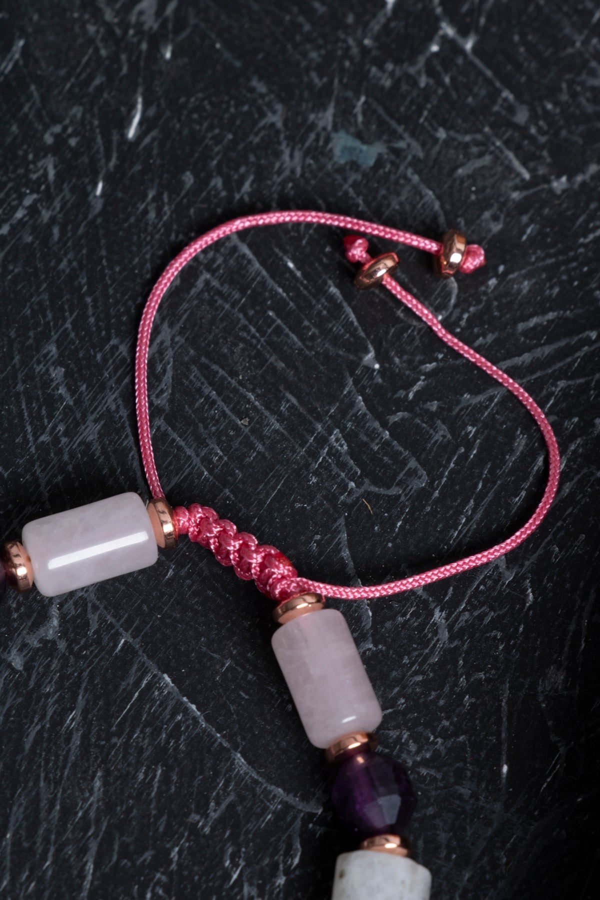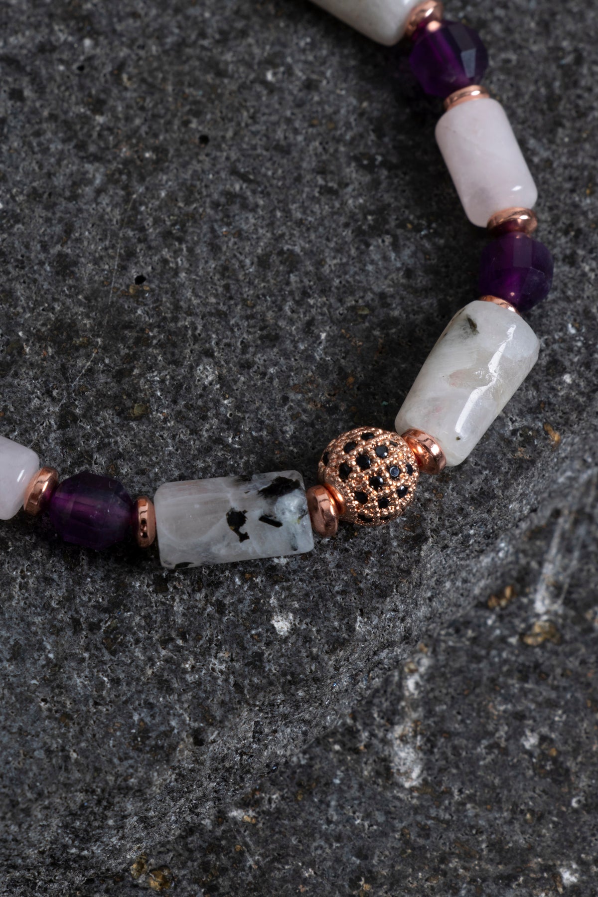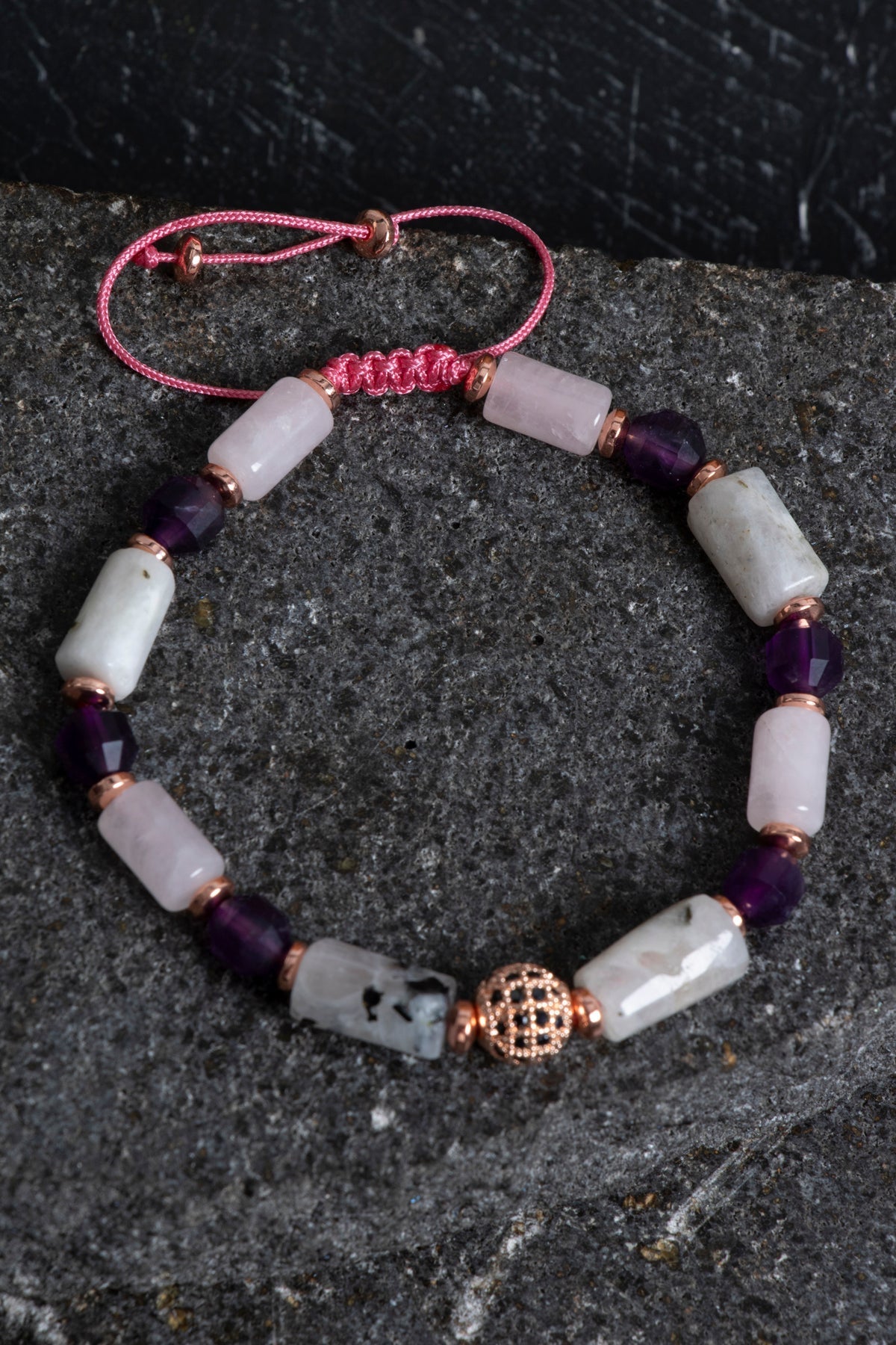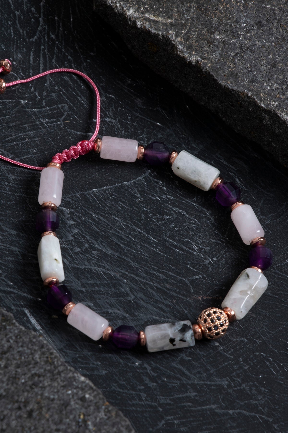 Ametistin zarif morunu, ay taşının büyüleyici parıltılarını ve pembe kuvarsın romantik tonlarını bir araya getiren bu bileklik; koleksiyonuna modern ve şık bir parça eklemek isteyenler için ideal seçimdir.