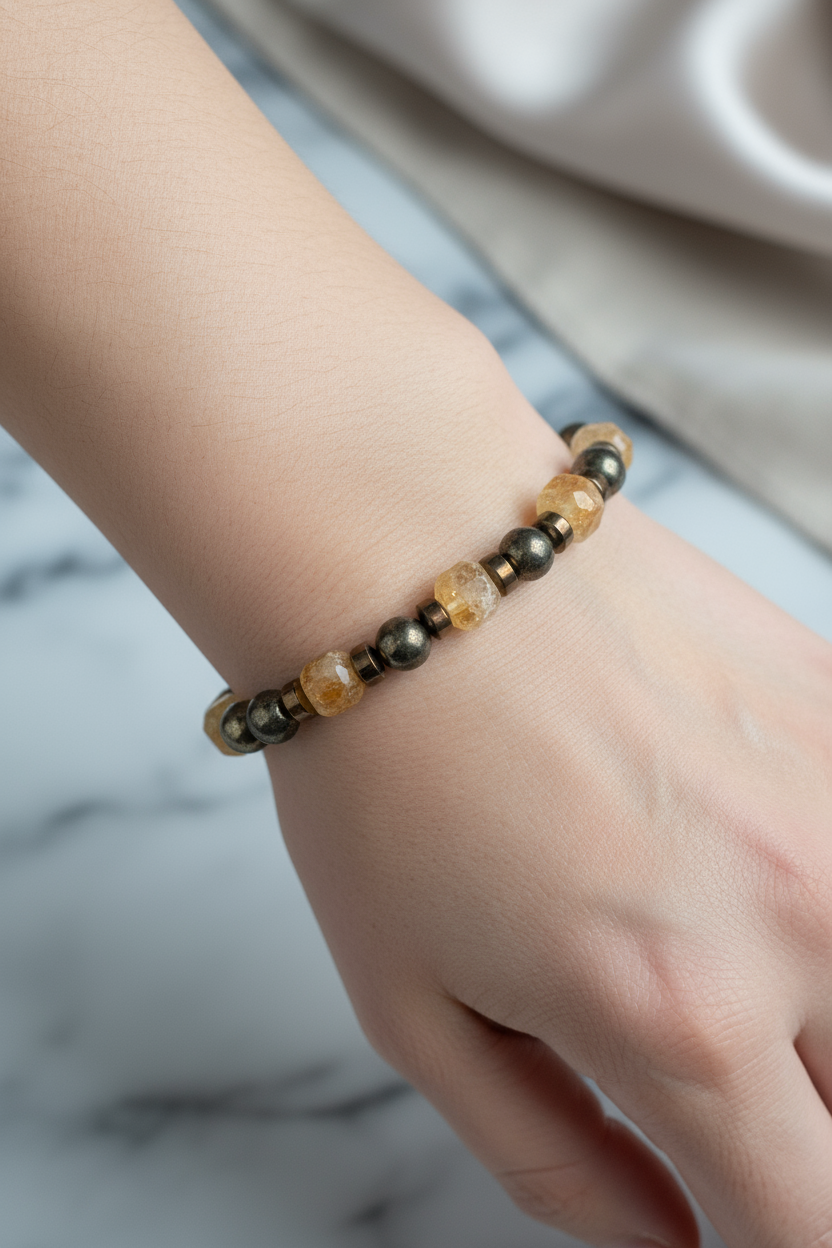 Pirit taşının altın tonları, sitrinin sıcak bal sarısı ışıltısı ve hematitin metalik gri parlaklığı bu bileklikte bir araya gelerek güçlü bir uyum oluşturuyor. 8 mm doğal taşlarla hazırlanmış misinalı form, bileğe konforlu bir oturuş sağlar ve günlük kullanımda rahatlık sunar. Hem sade hem de şık tasarımıyla farklı kombinlerde sofistike bir tamamlayıcıdır.